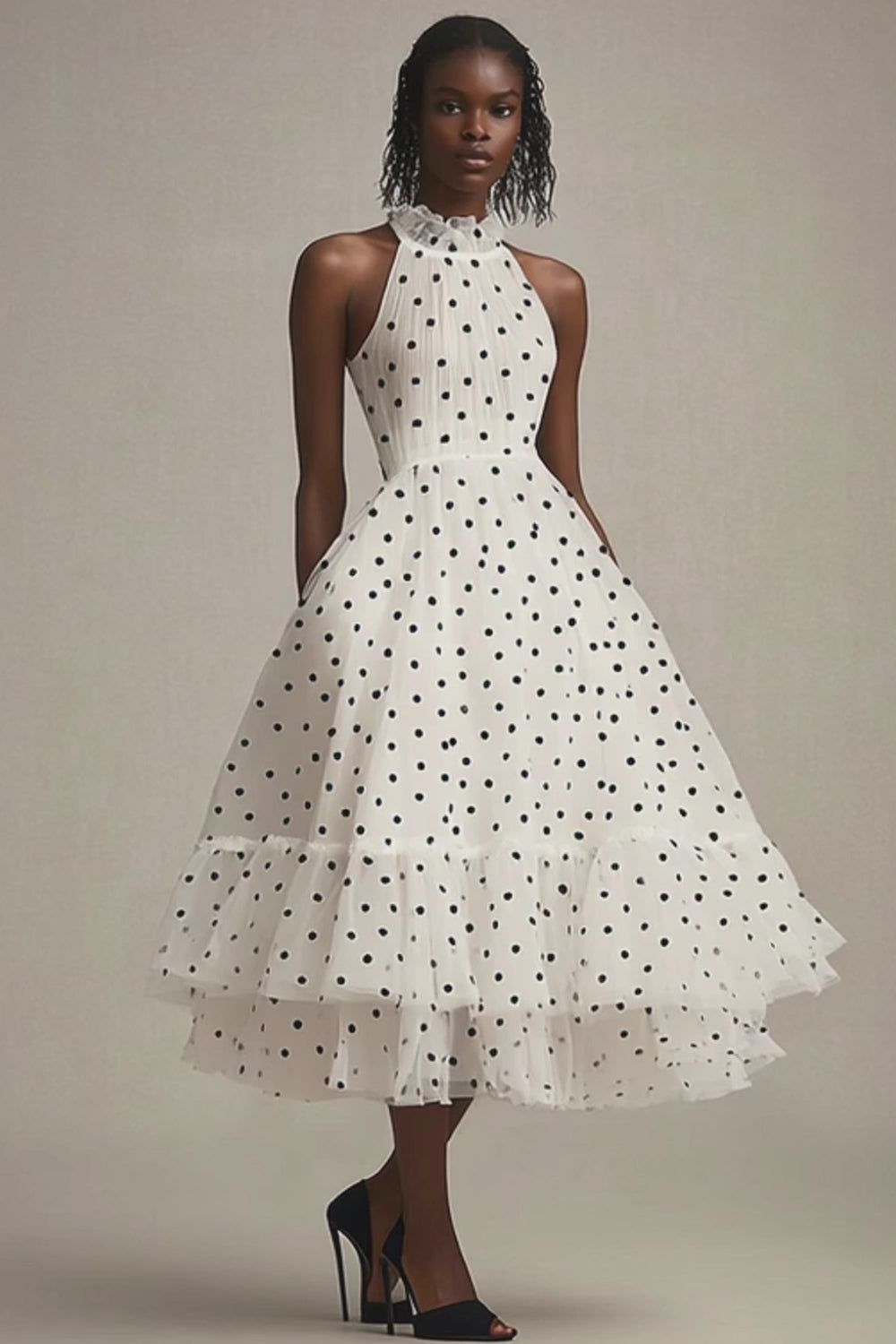 A Line Gegolfde Hoge Hals Wit Zwart Polka Dots Jurk