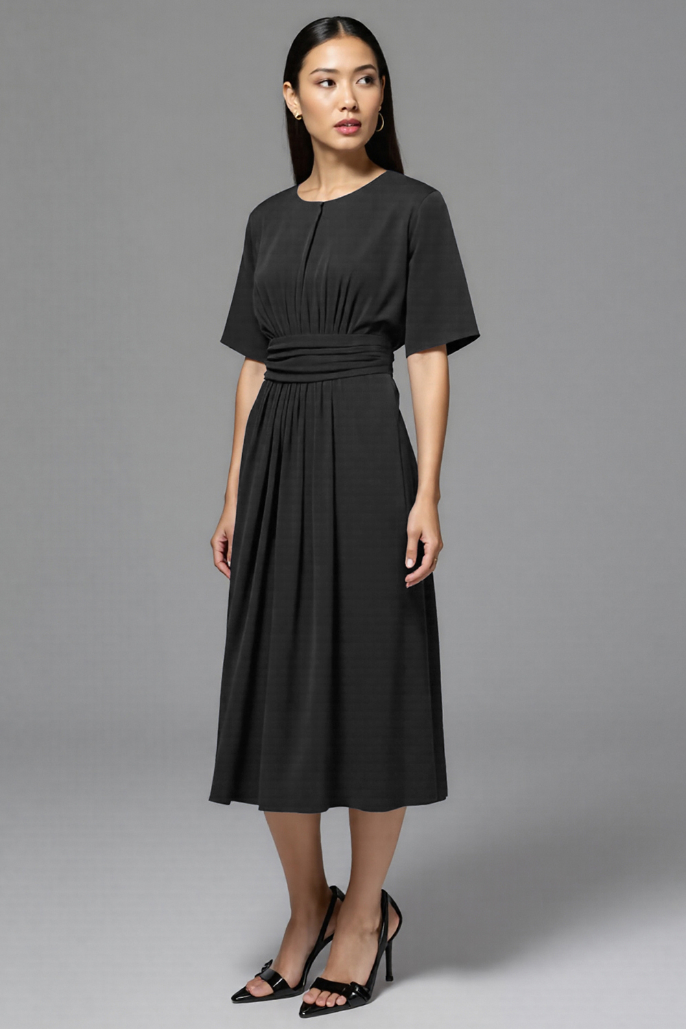 A Line marineblauwe midi-werkjurk met ruches en ronde hals