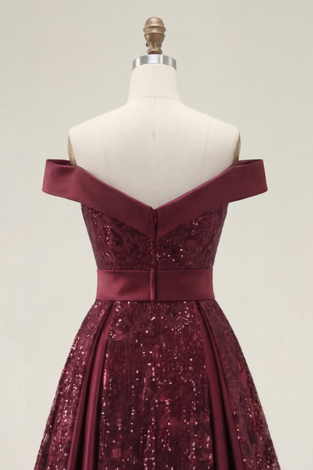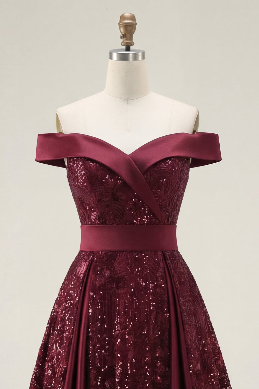 Glinsterende off-the-shoulder bordeauxrode A-lijn pailletten lange galajurk