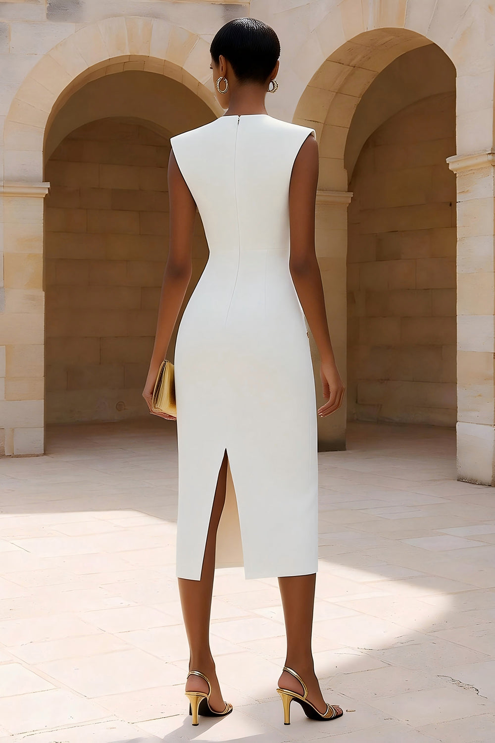 Ivoorkleurige satijnen bateau hals zeemeermin dubbelgeknoopte werkjurk