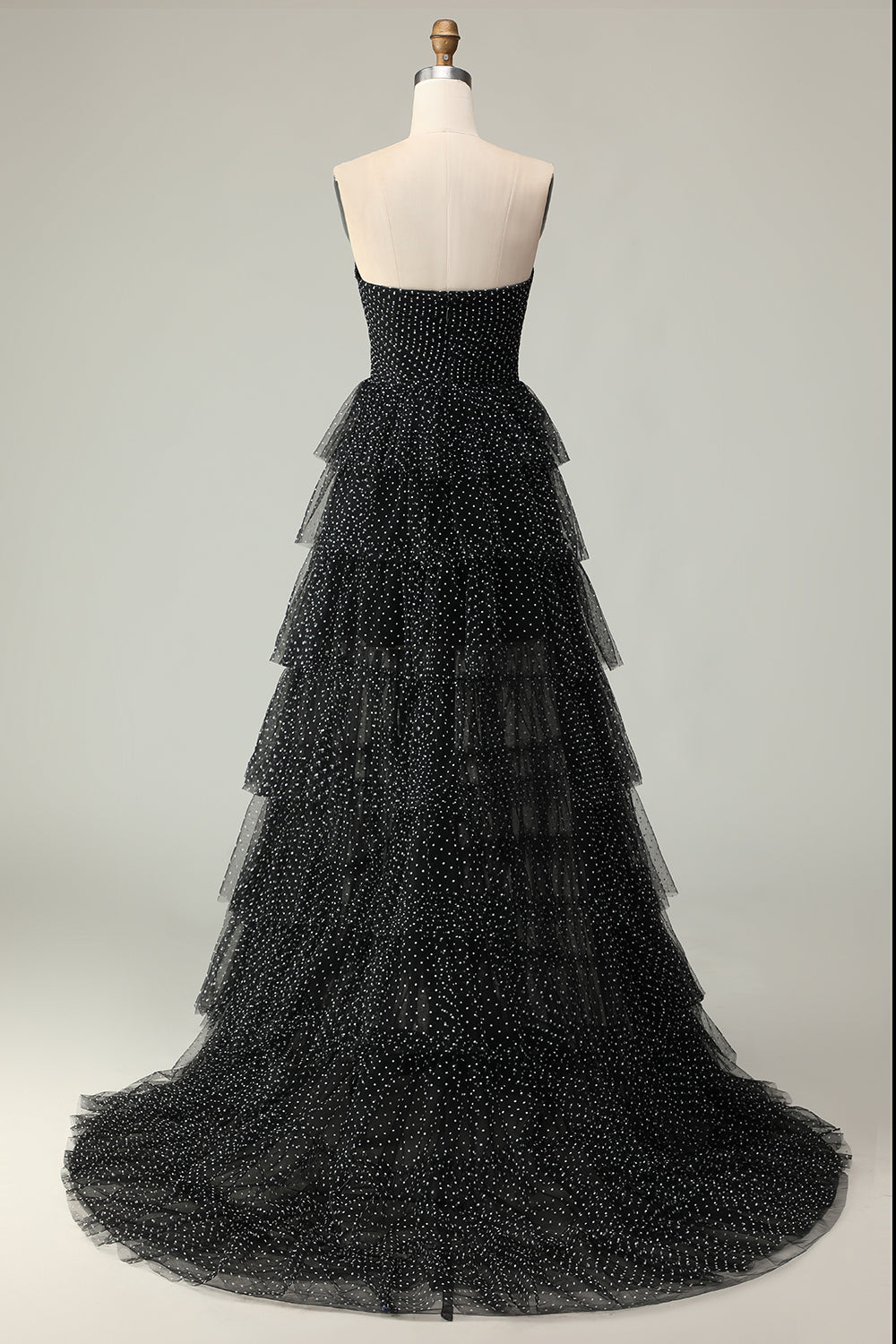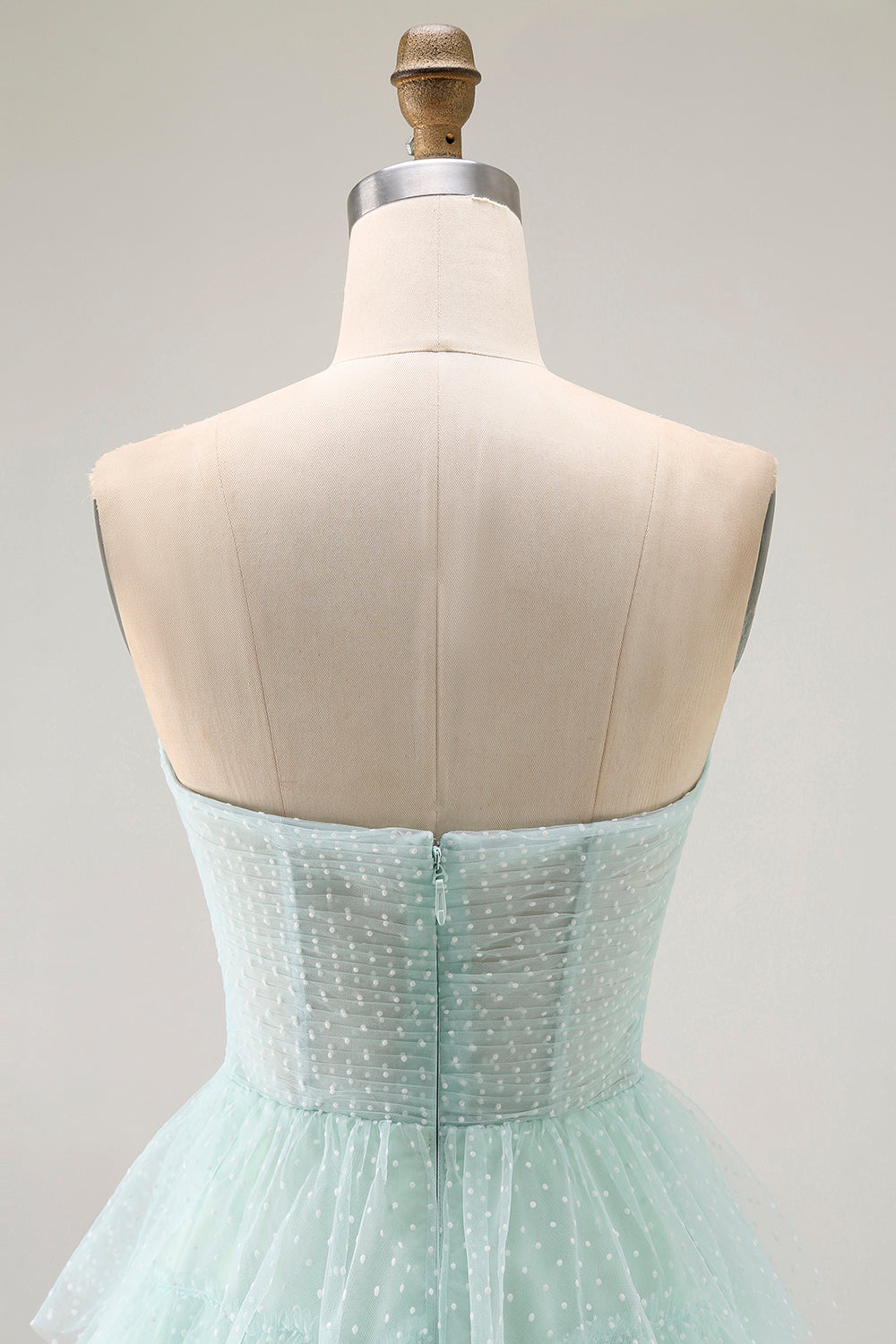 Lichtgroene strapless A Line Polka Dots gelaagde ruches bruidsmeisjesjurk met split