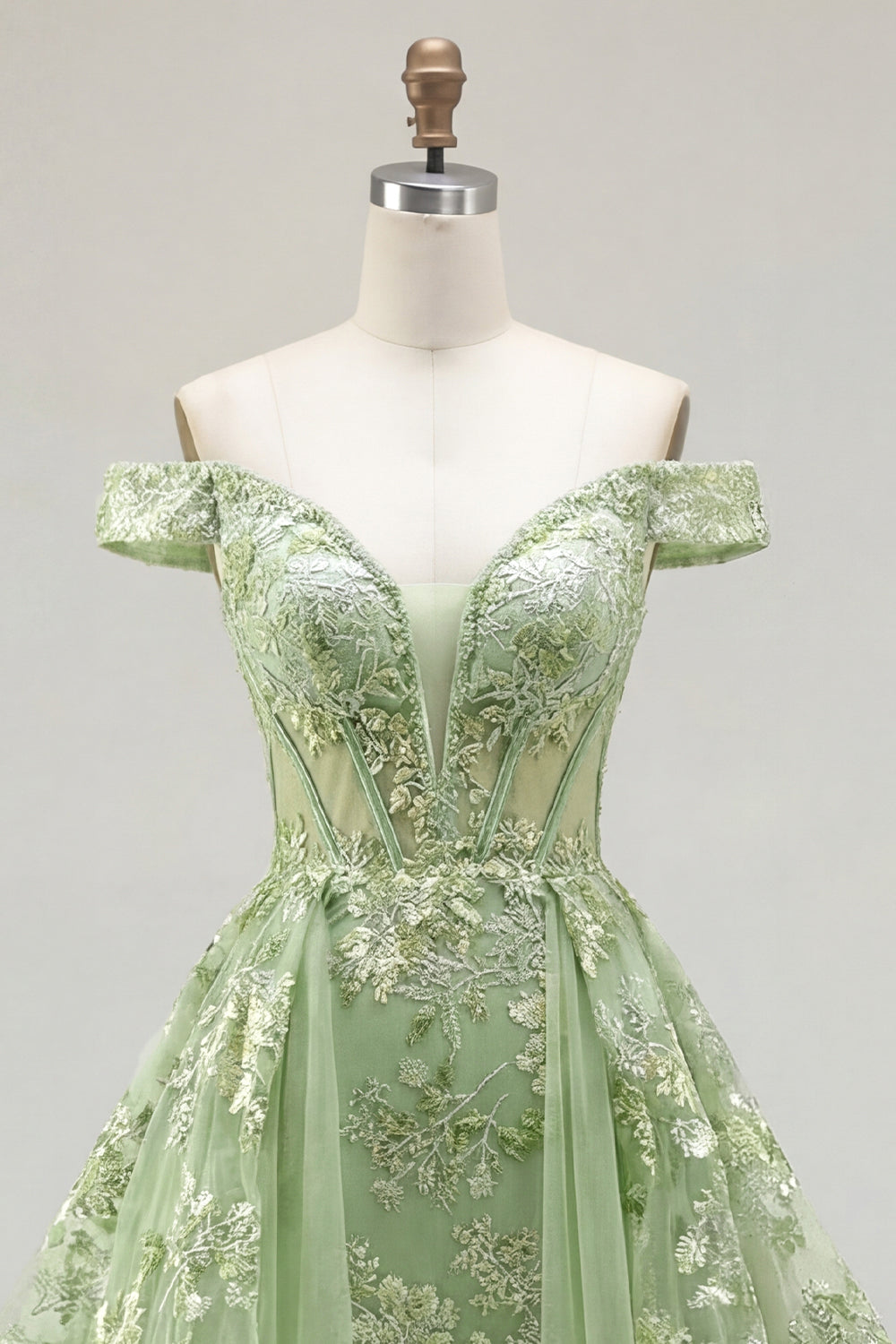 Off-the-shoulder groene A-lijn geappliqueerde korset bloemenjurk met lange gala en ruches