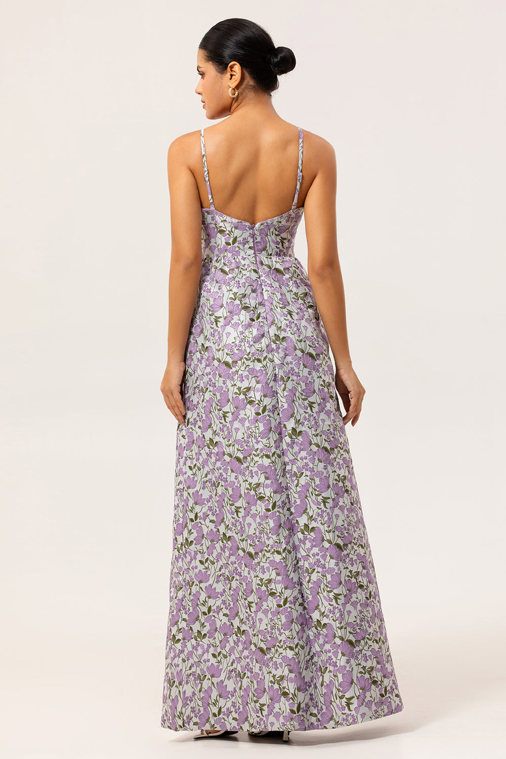 Paarse bloemen A-lijn bedrukte spaghettibandjes bruiloftsgastjurk