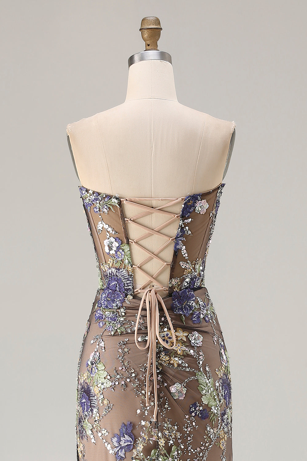 Zwarte meermin strapless korset met pailletten lange galajurk met split
