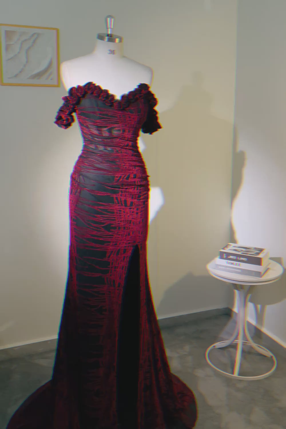 Zwarte rode zeemeermin met een korset met gerimpeld lange galajurk met split