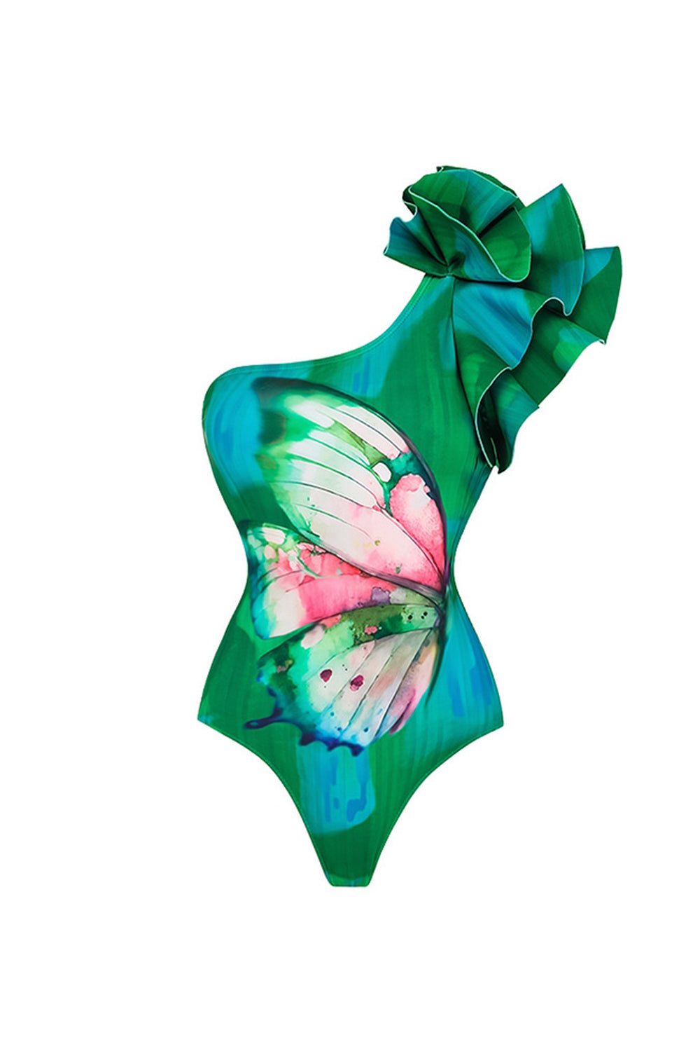 Donkergroen eenschouder tweedelig badpak met ruches en een overdek