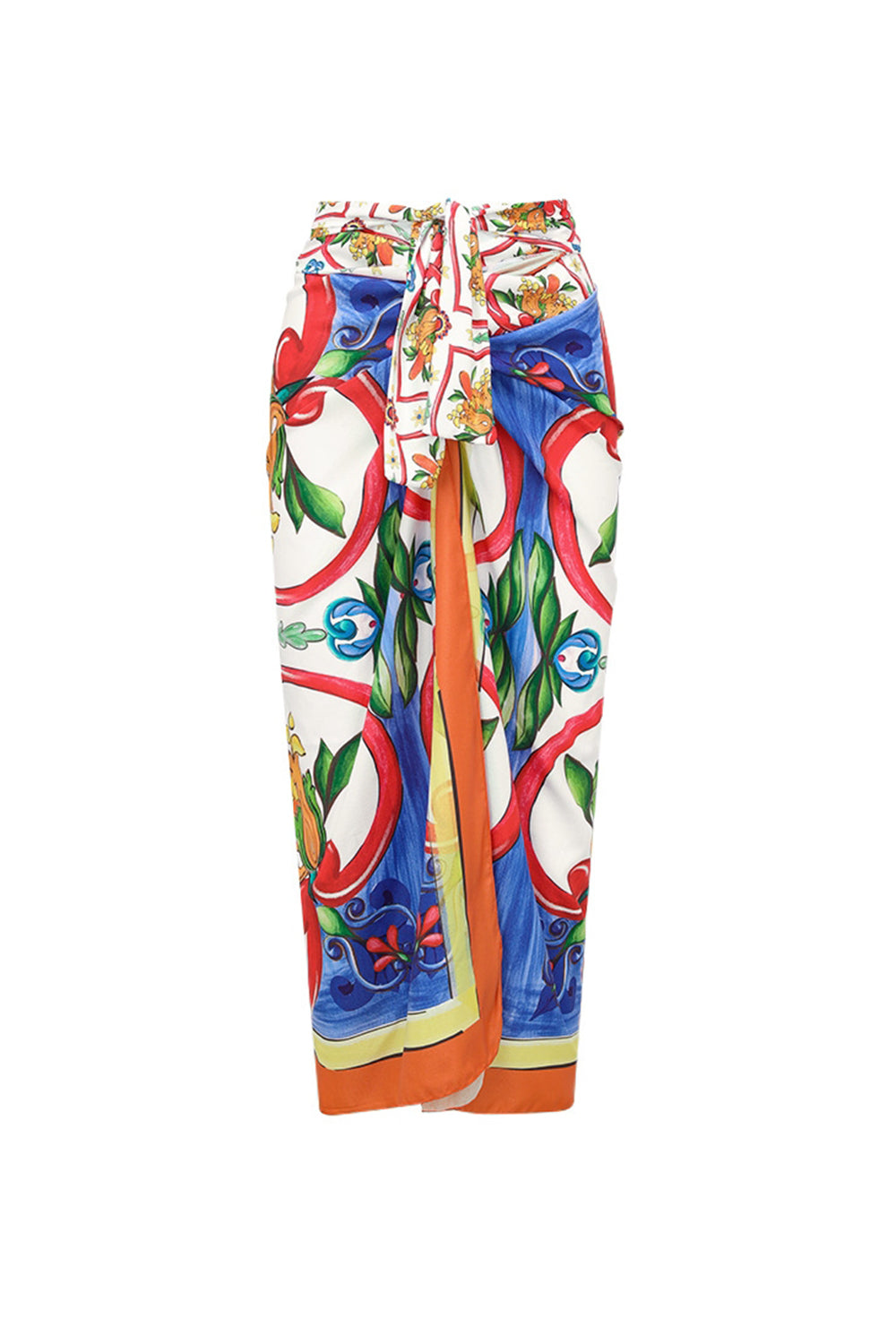 Eén schouder tweedelige oranjeblauwe print badkleding met een overdekjurk