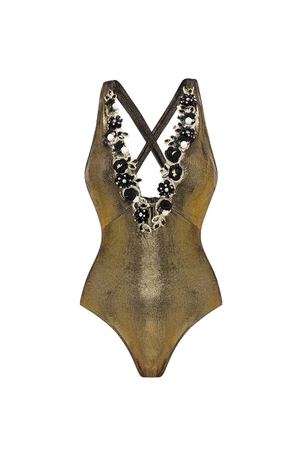 Metallic gouden 2-delige V-hals 3D Flowers badpak met strandjurk