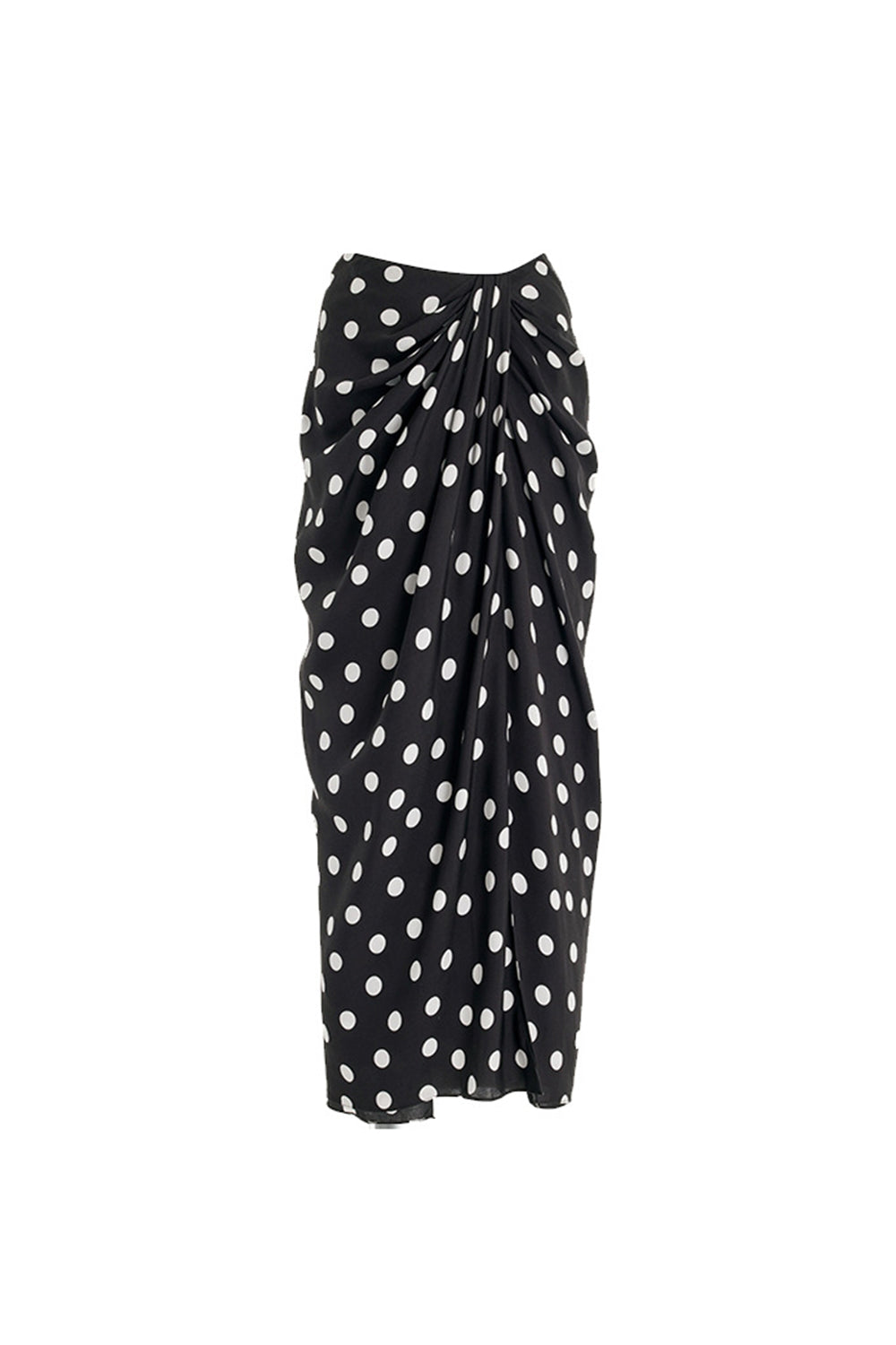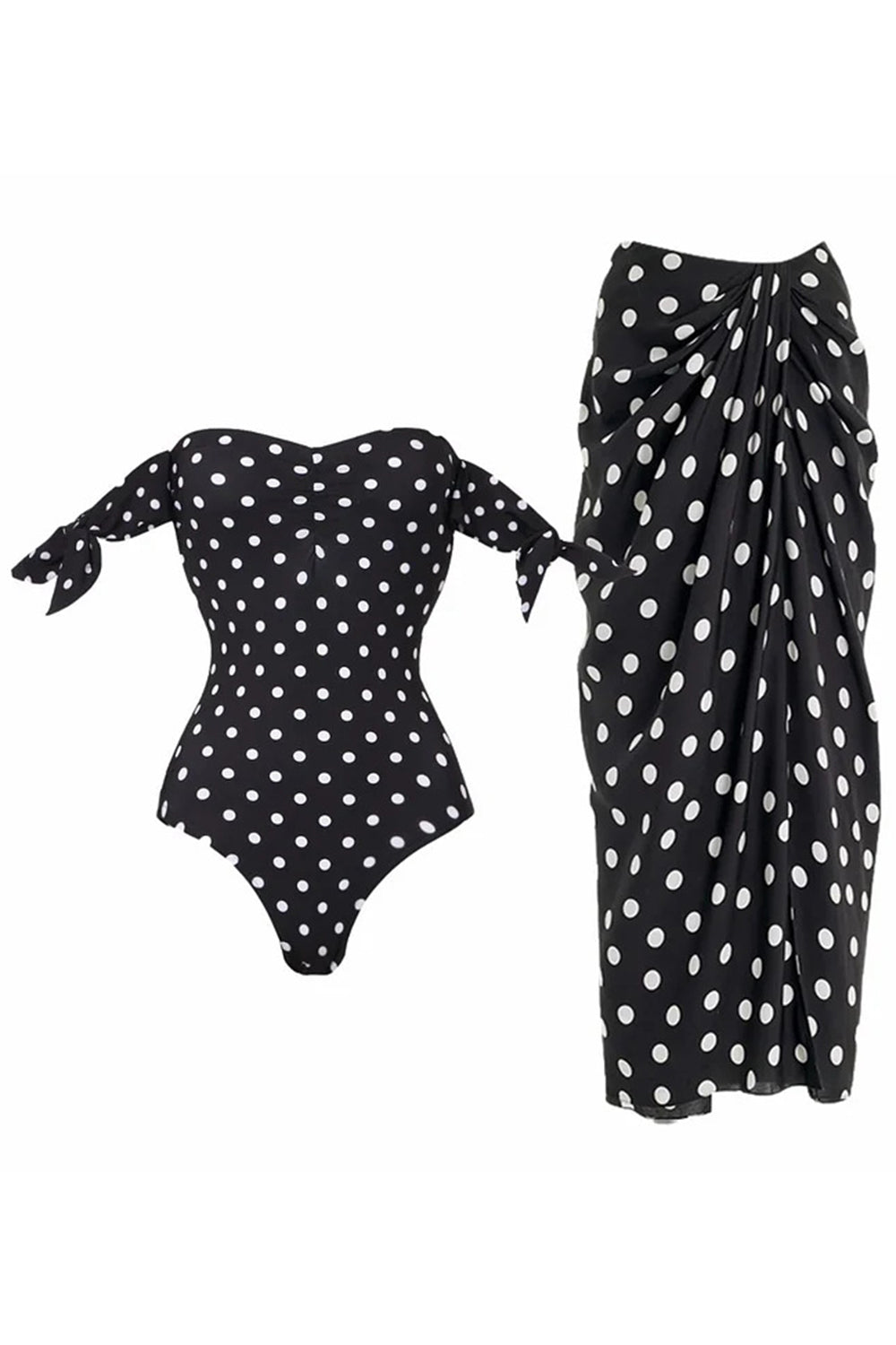 Off-the-shoulder tweedelig zwart wit stippen badpak met bedekkingrok