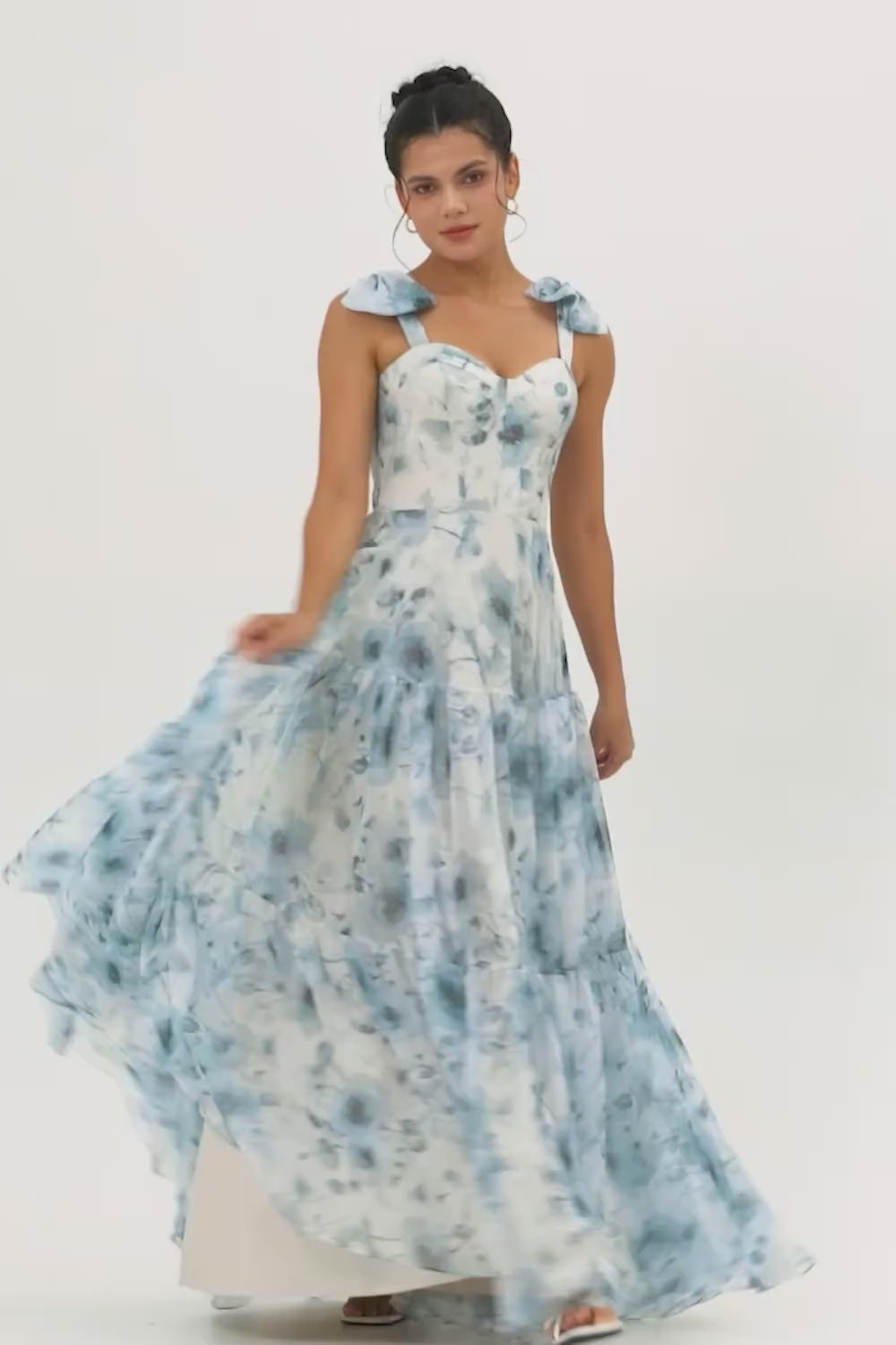 Blauwe bloem bedrukt een lijn lange bruidsmeisjesjurk met vetersluiting op de rug