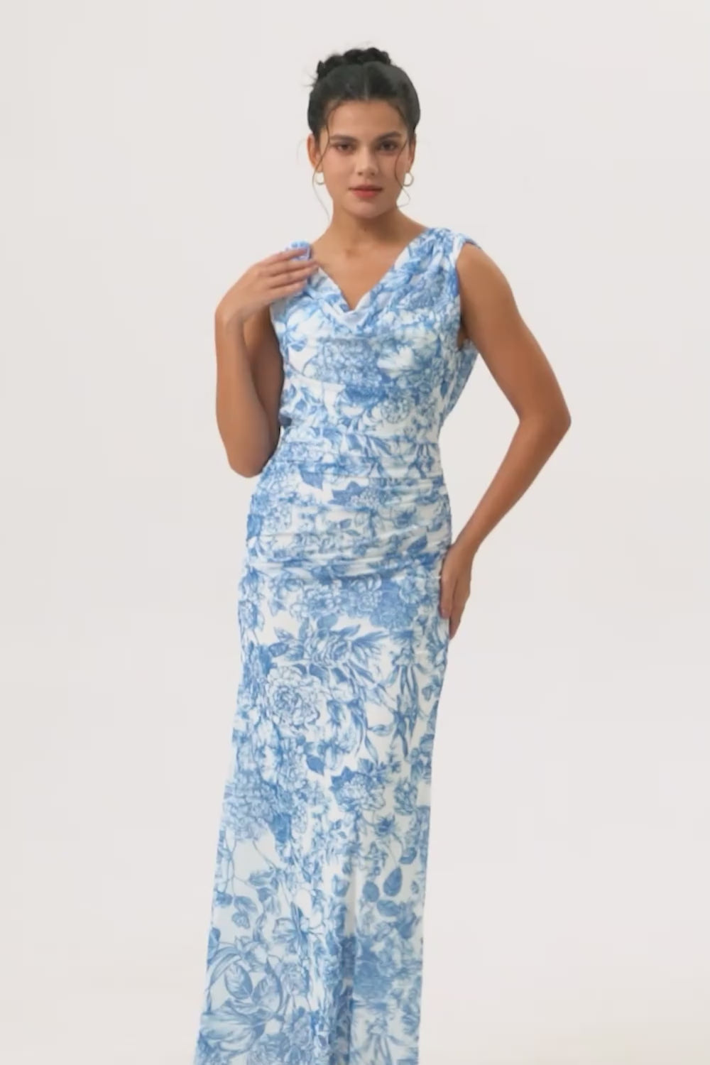 Blauwe bloem Cowl hals schede afgedrukt lange bruidsmeisjesjurk met split