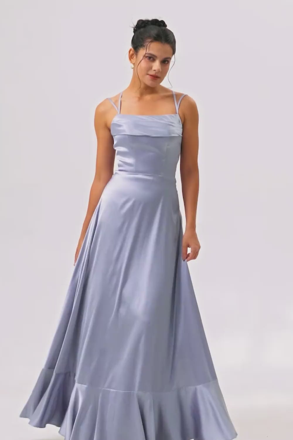 Stoffige blauwe A Line lange bruidsmeisjesjurk met vetersluiting aan de achterkant