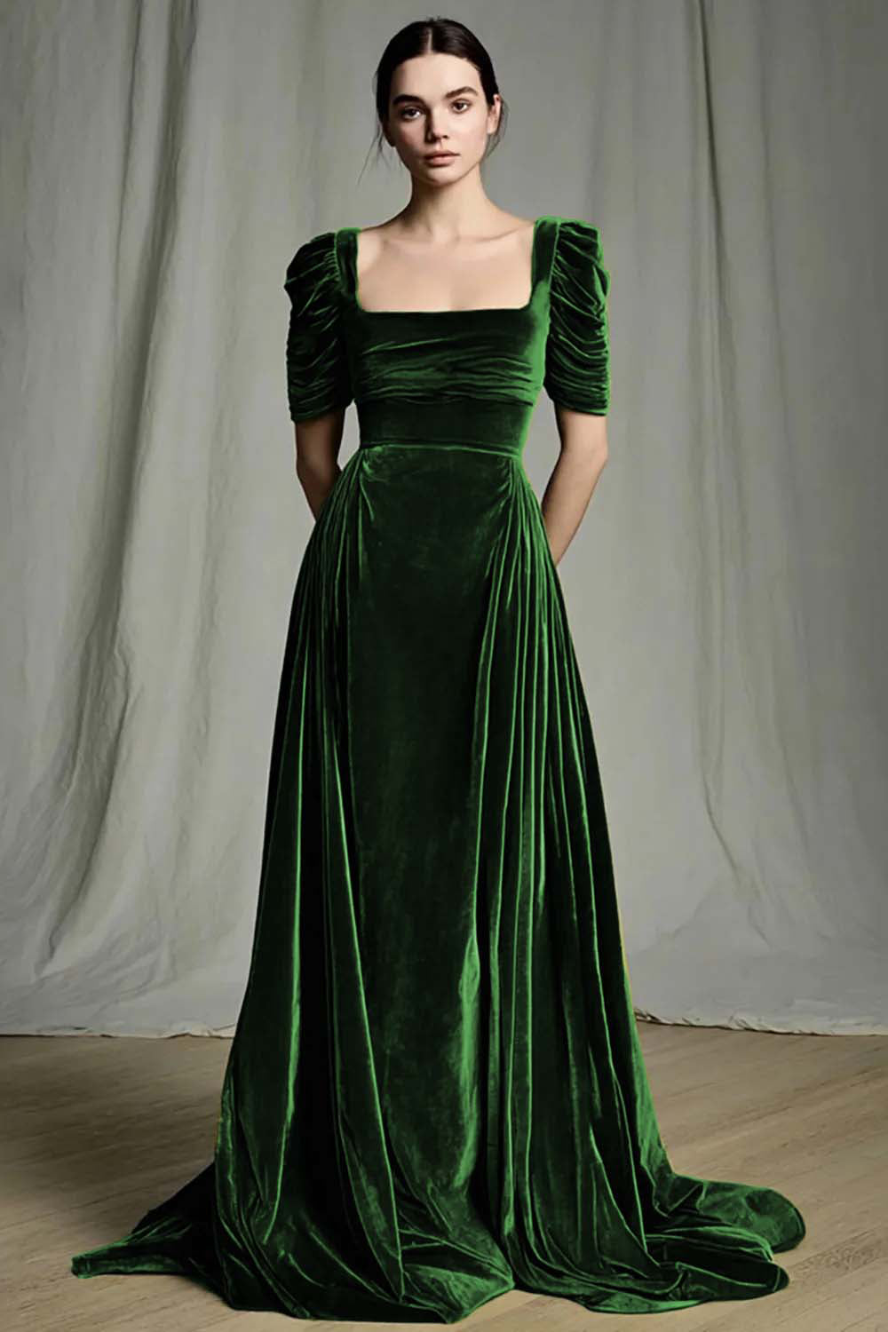 Olijfkleurige A-lijn fluwelen lange formele jurk met vierkante hals
