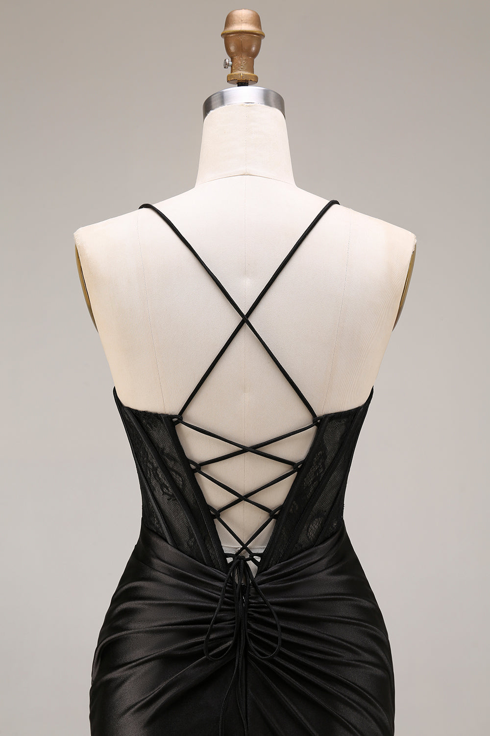 Zwarte satijnen spaghettibandjes zeemeermin lange formele jurk met split