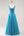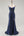 Een lange blauwe galajurk met kralen en applicaties