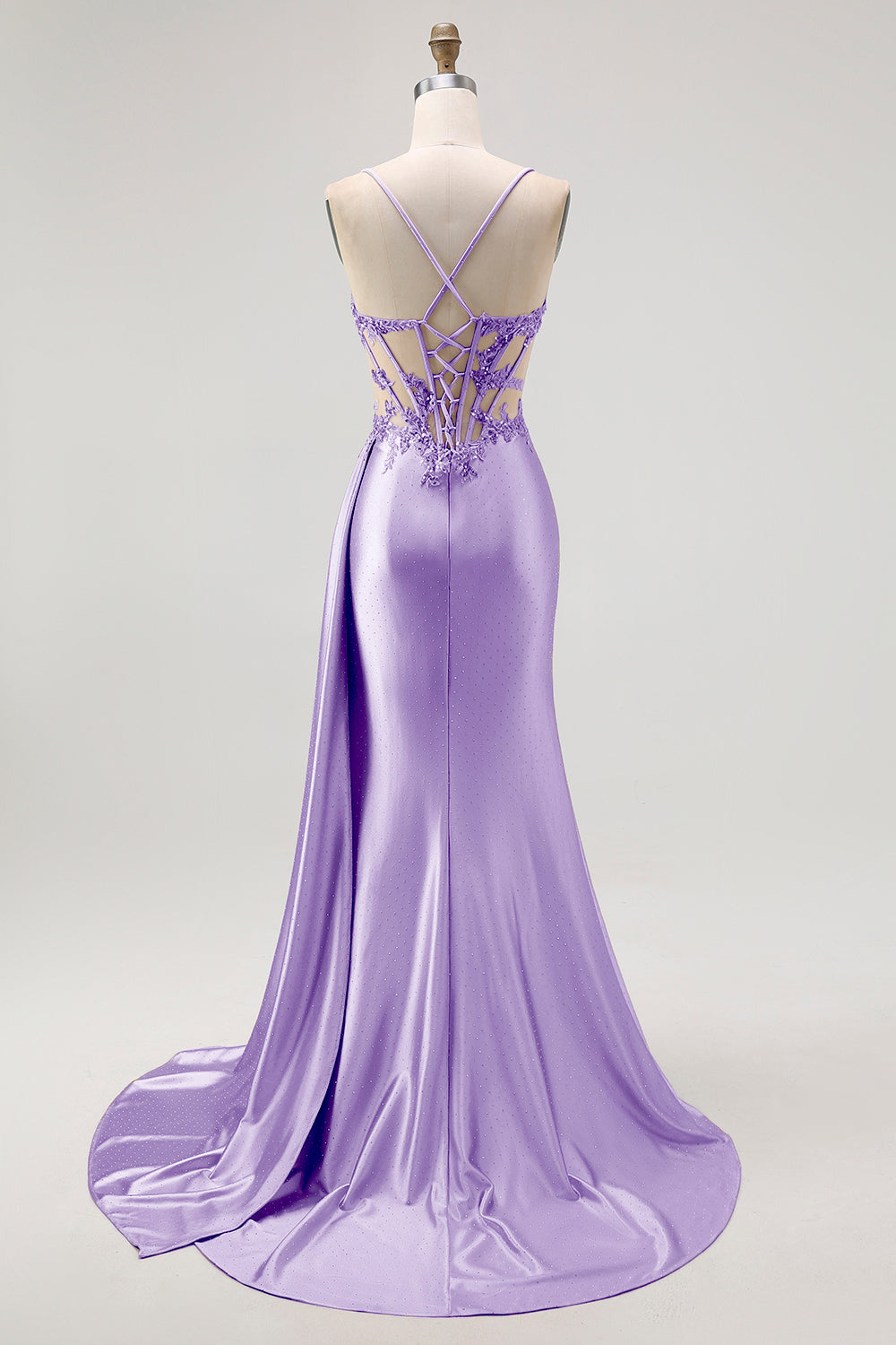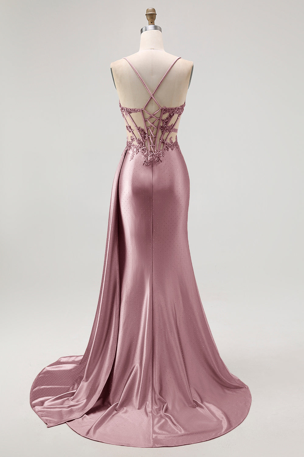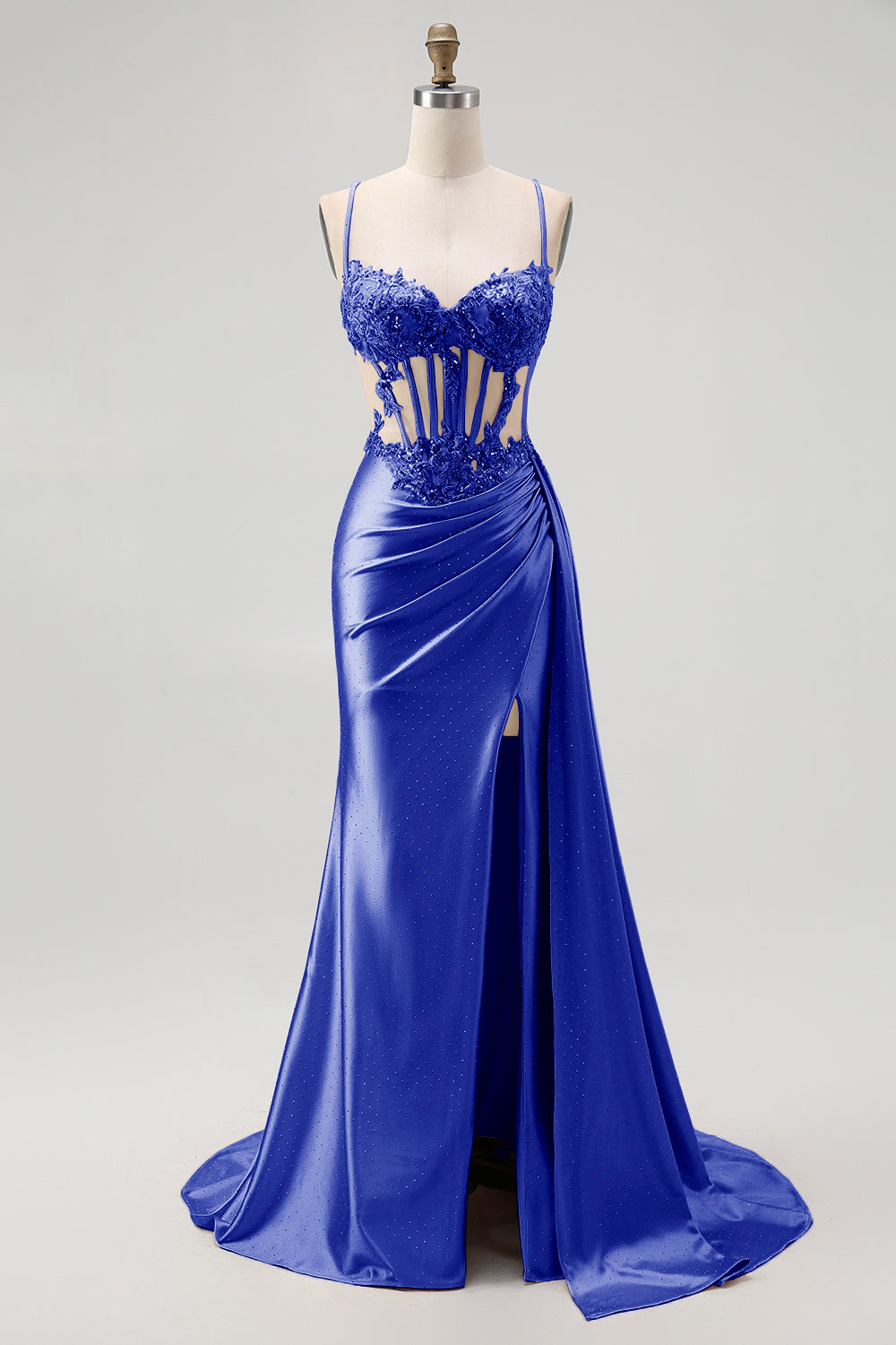 Champagne zeemeermin doorschijnend korset met kralen bezette zijslinger lange galajurk met split