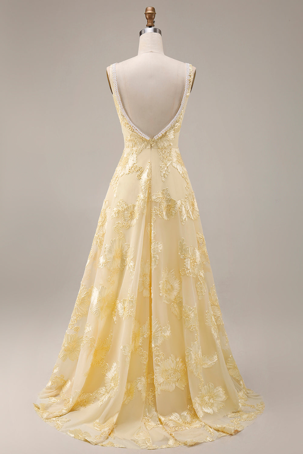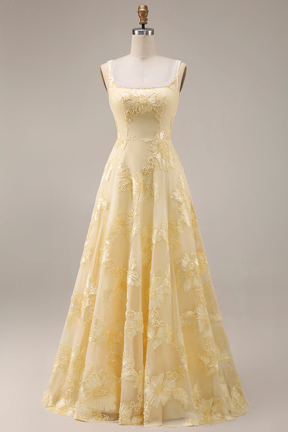 Geel A-lijn vierkante hals lange galajurk met borduurwerk