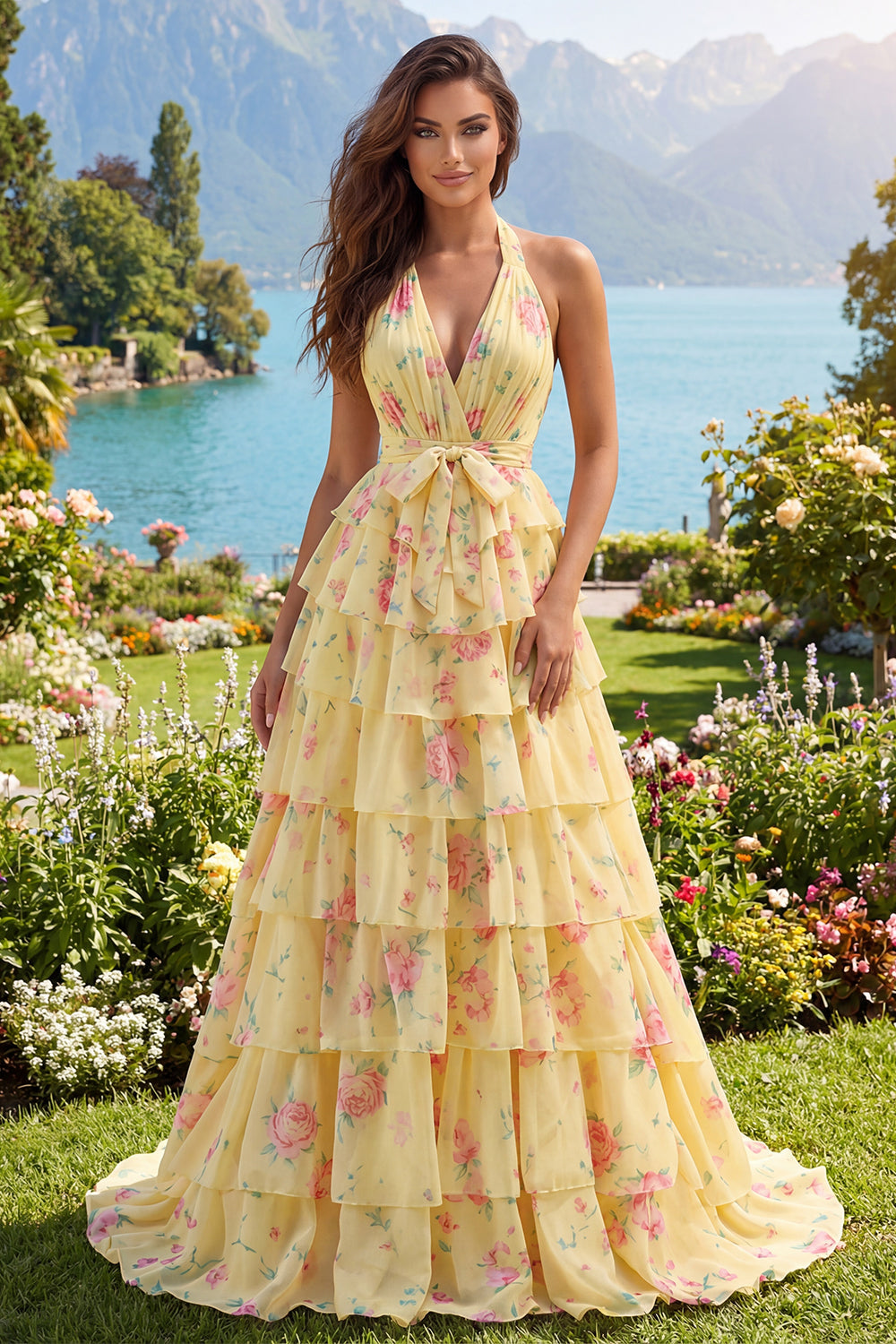 Gele halter Een lijn bloemenjurk met lange galajurk en ruches
