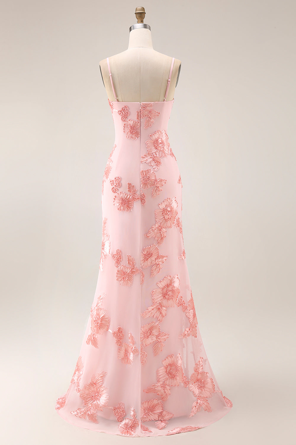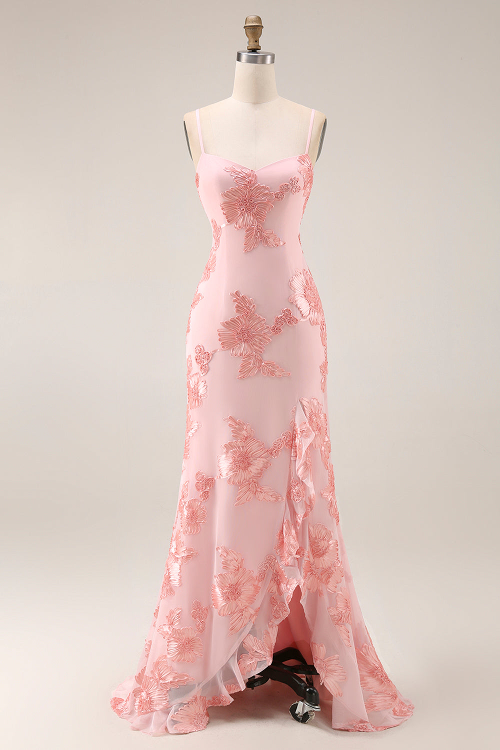 Gele schede bloemenborduurde lange galajurk met ruchesplit