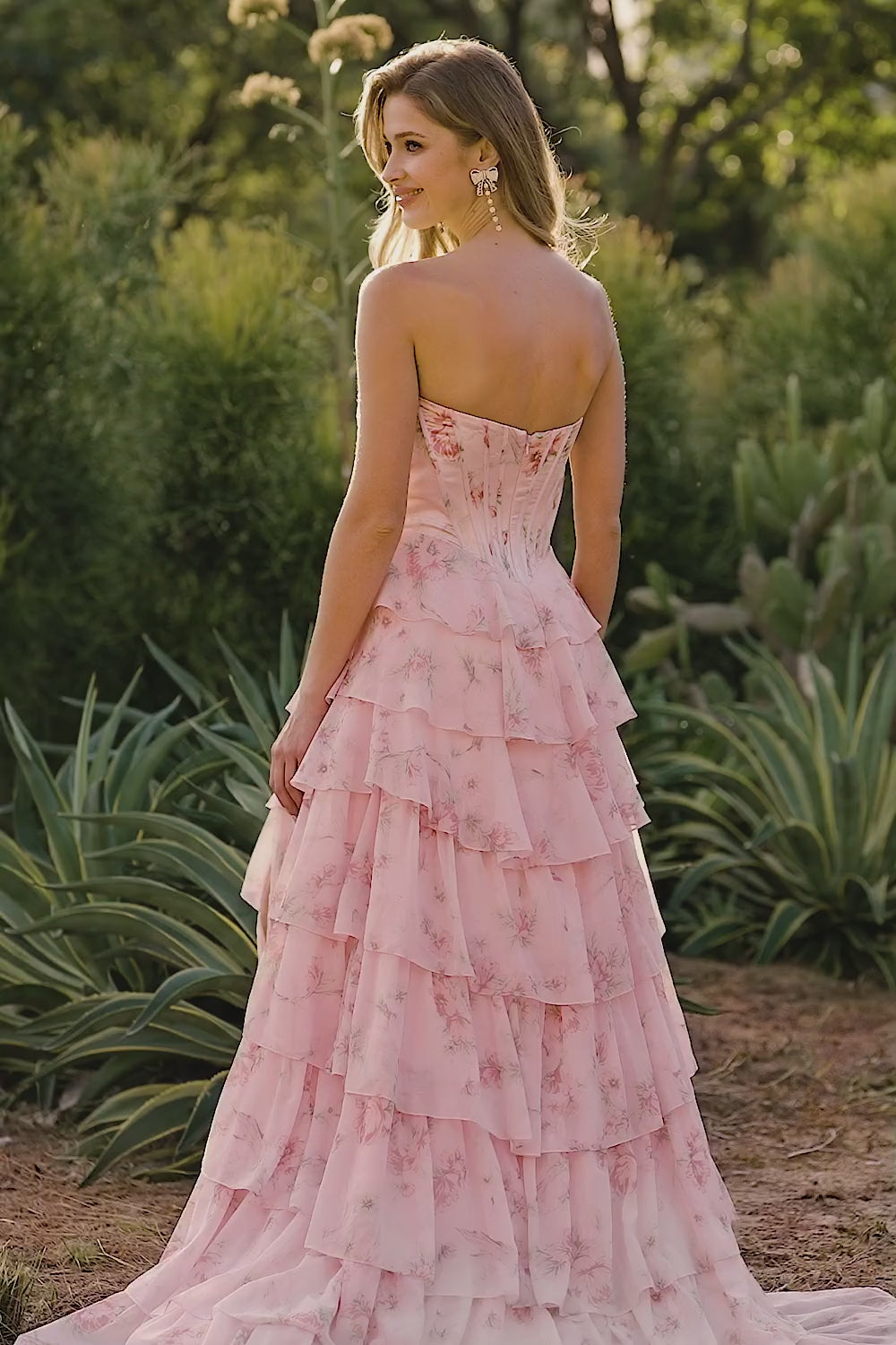 Roze strapless A-lijn korset lijfje Bloemen galajurk met chiffon rucherok