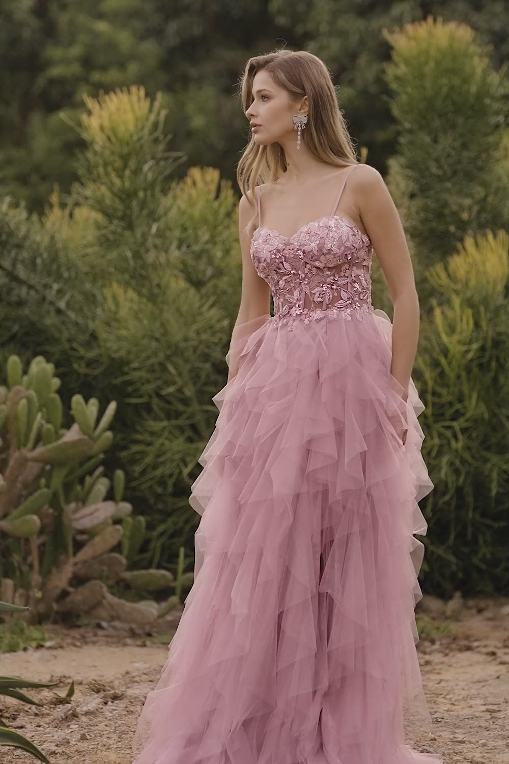 Roze strapless A-lijn kralen, gerimpelde lange galajurk met split