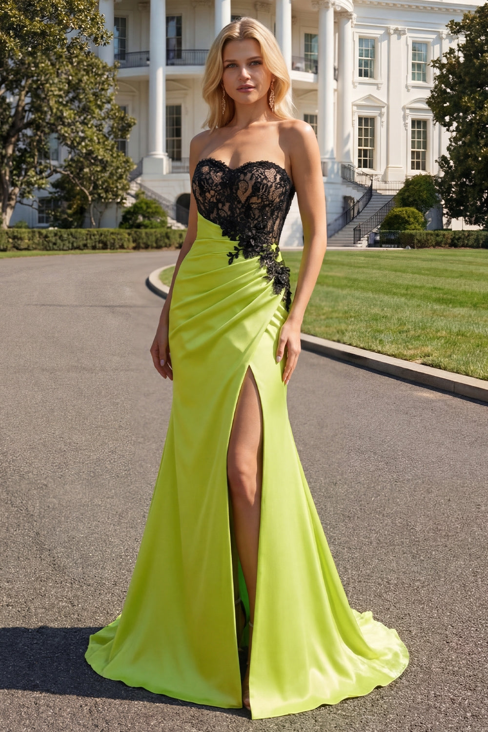 Strapless zeemeermin zwart groen geappliqueerd kant lange galajurk met split