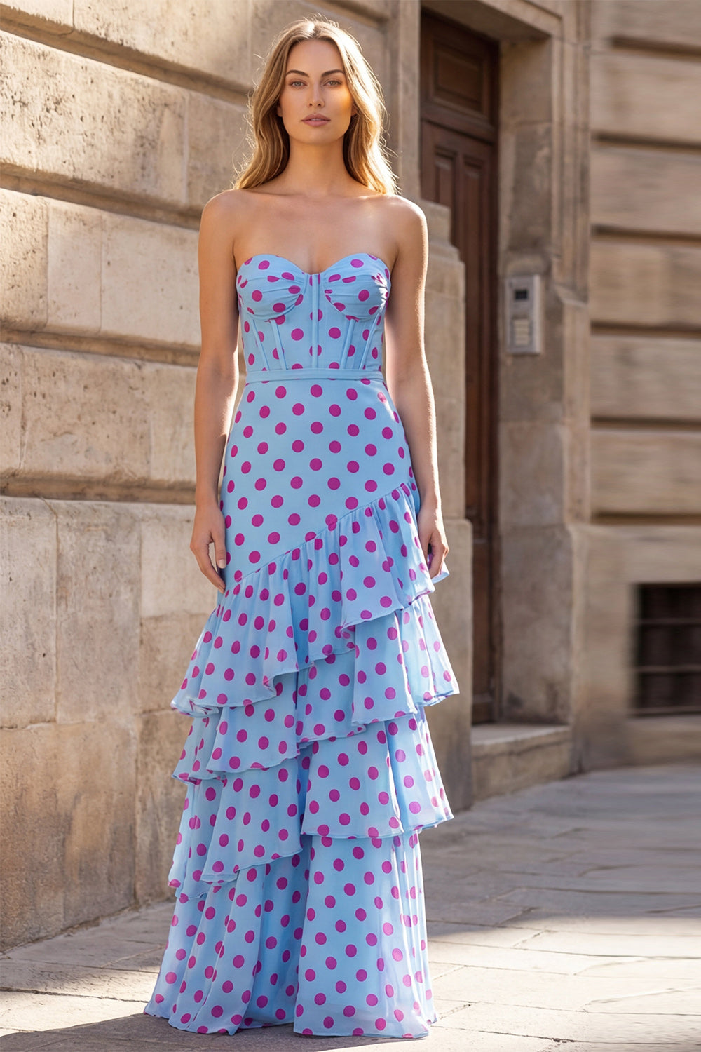 Zwarte polkadots schede sweetheart korset met gerimpelde lange galajurk