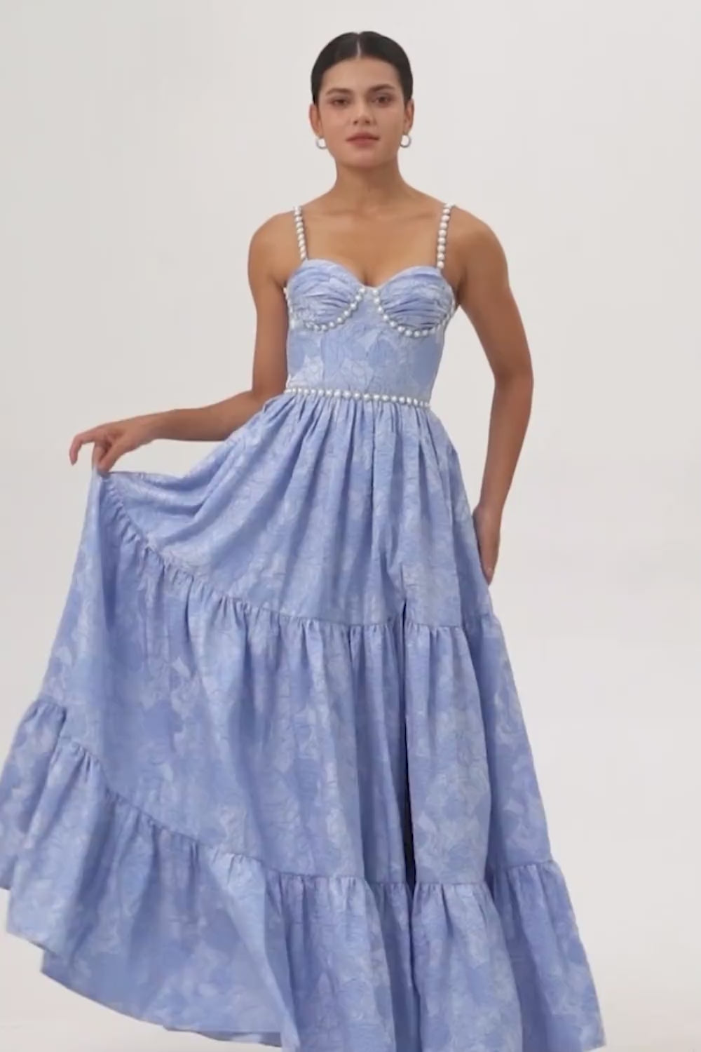 Blauwe bloem A-lijn kralen bruiloft gast jurk met split