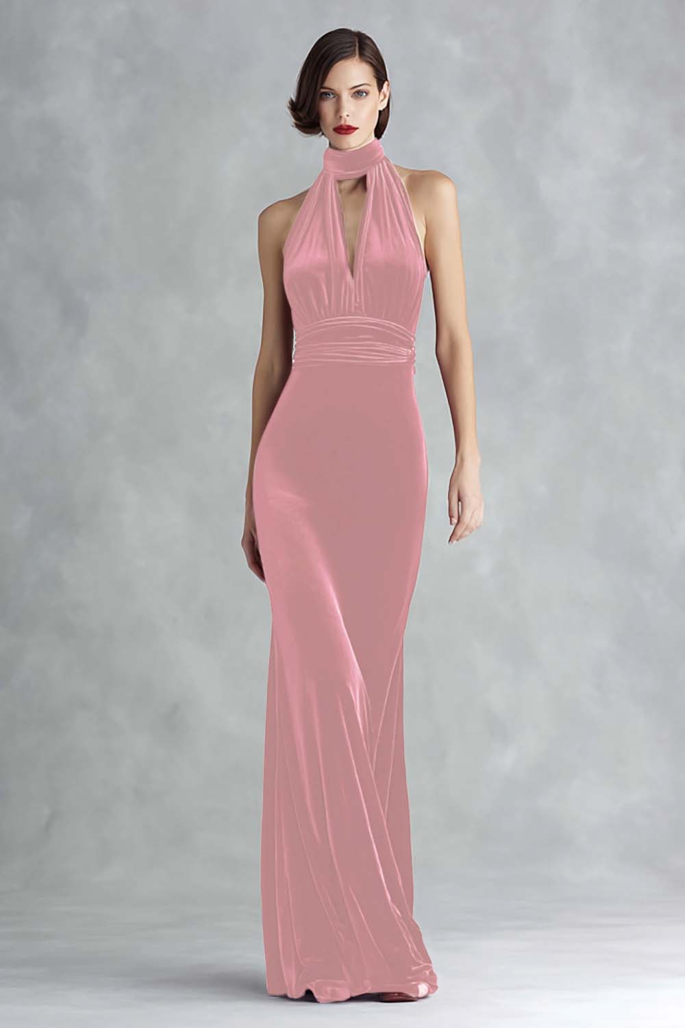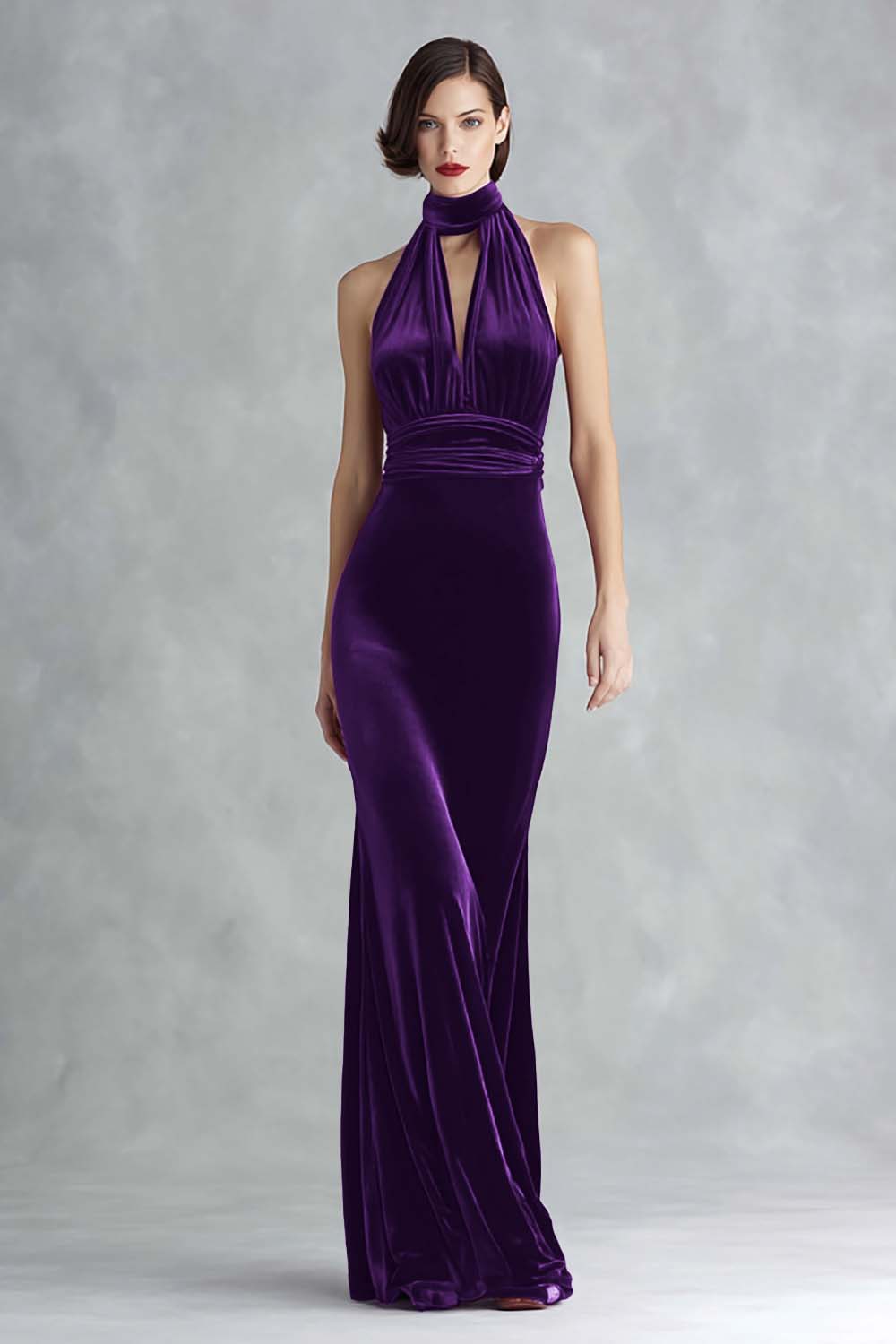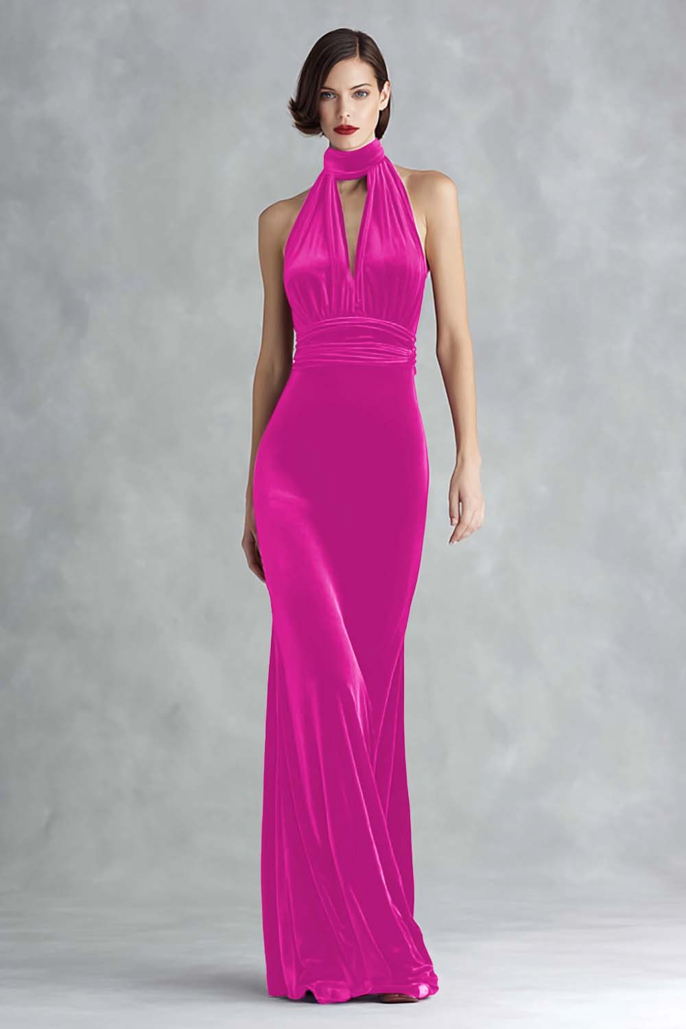 Bordeauxrode fluwelen halter sleutelgat lange formele jurk