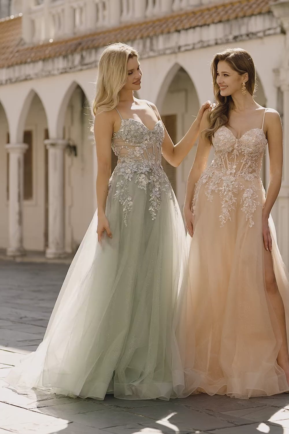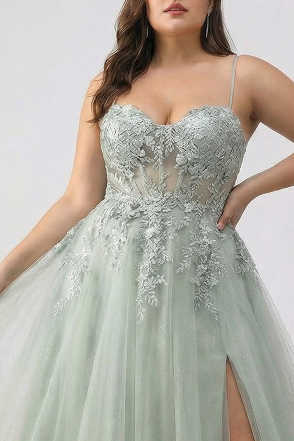 Draft-Sage Green A-lijn geborduurde lange tule galajurk met split