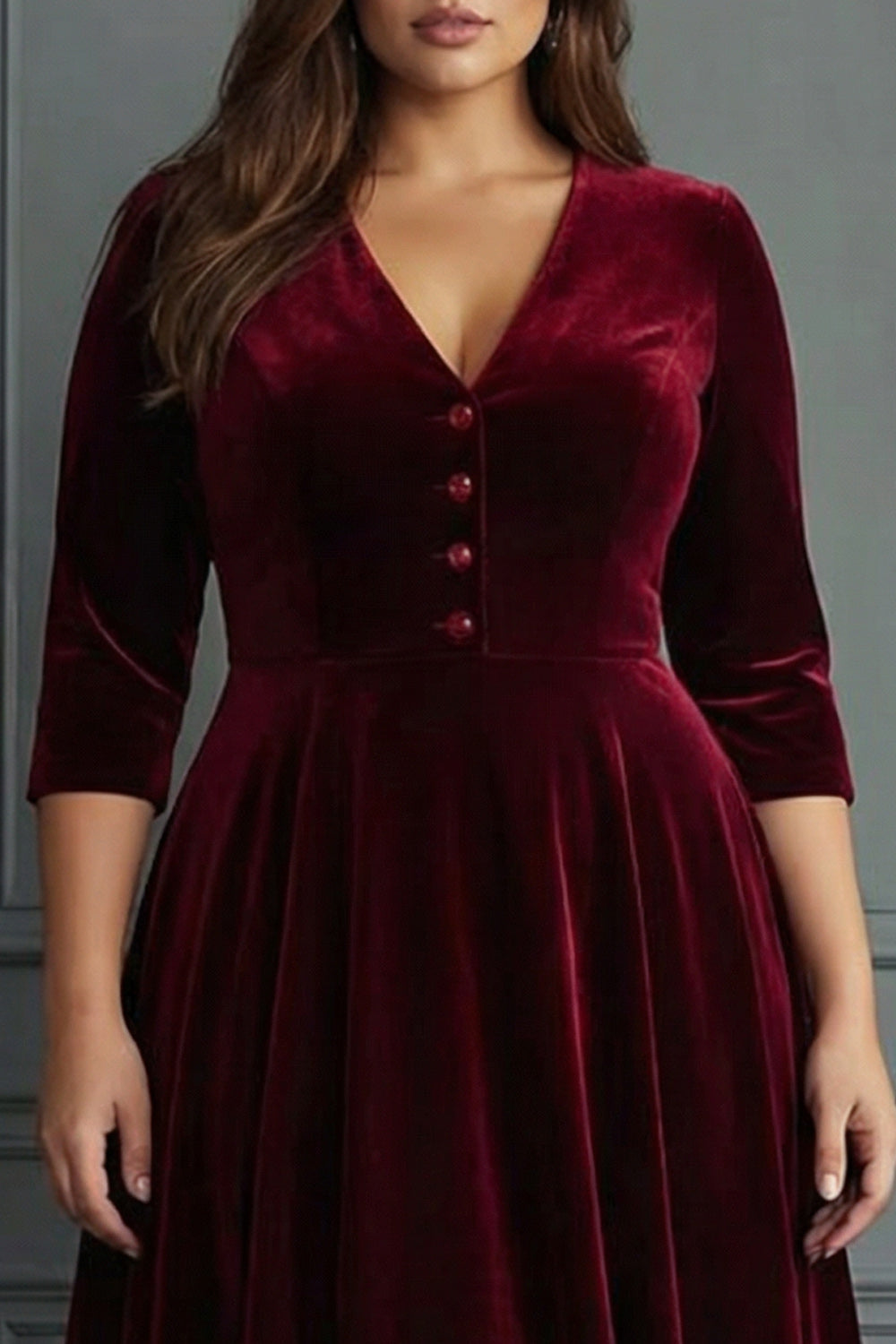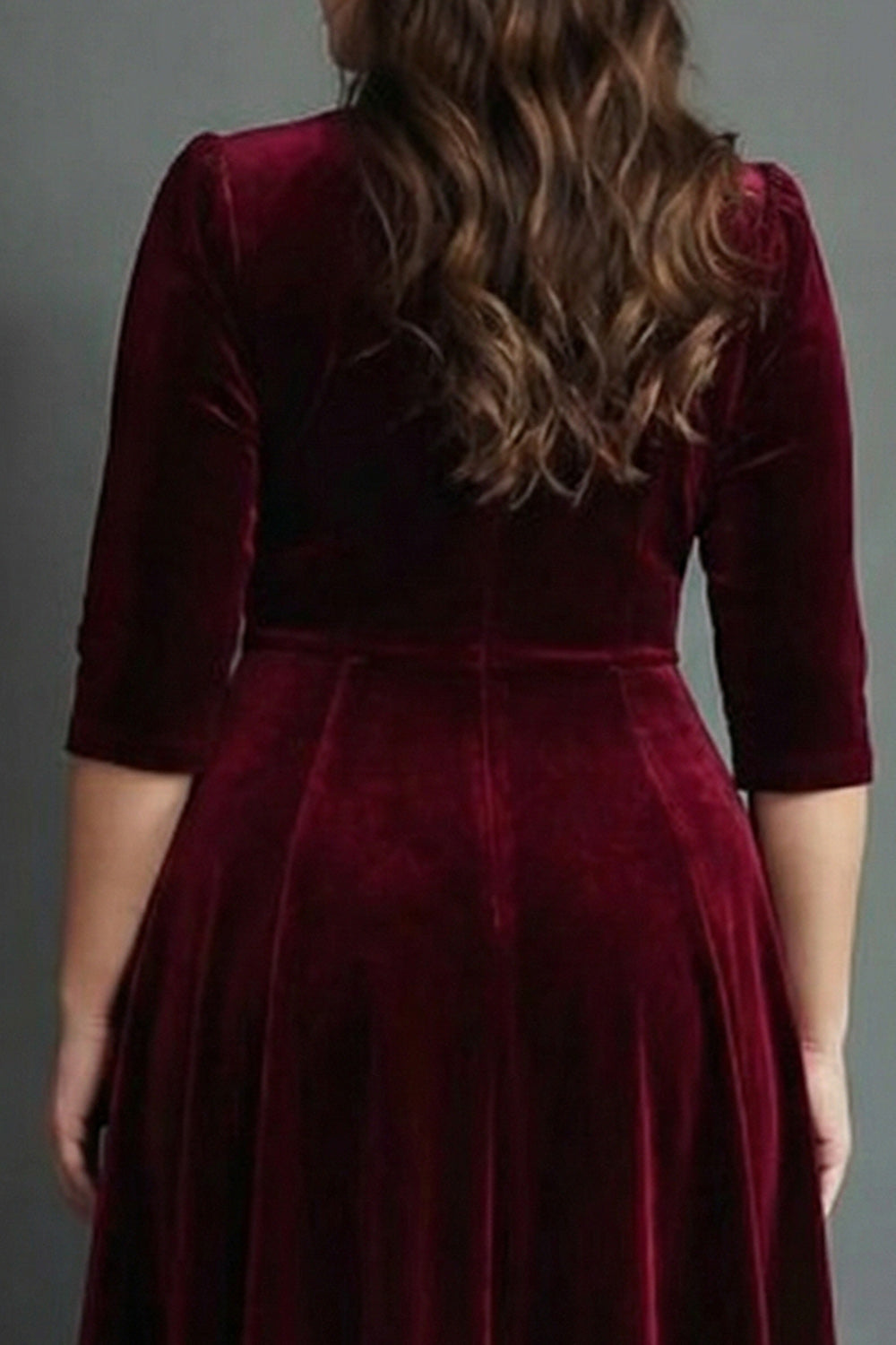Plusmaat bordeauxrode fluweel A Line V-hals midi werkjurk met halve mouwen