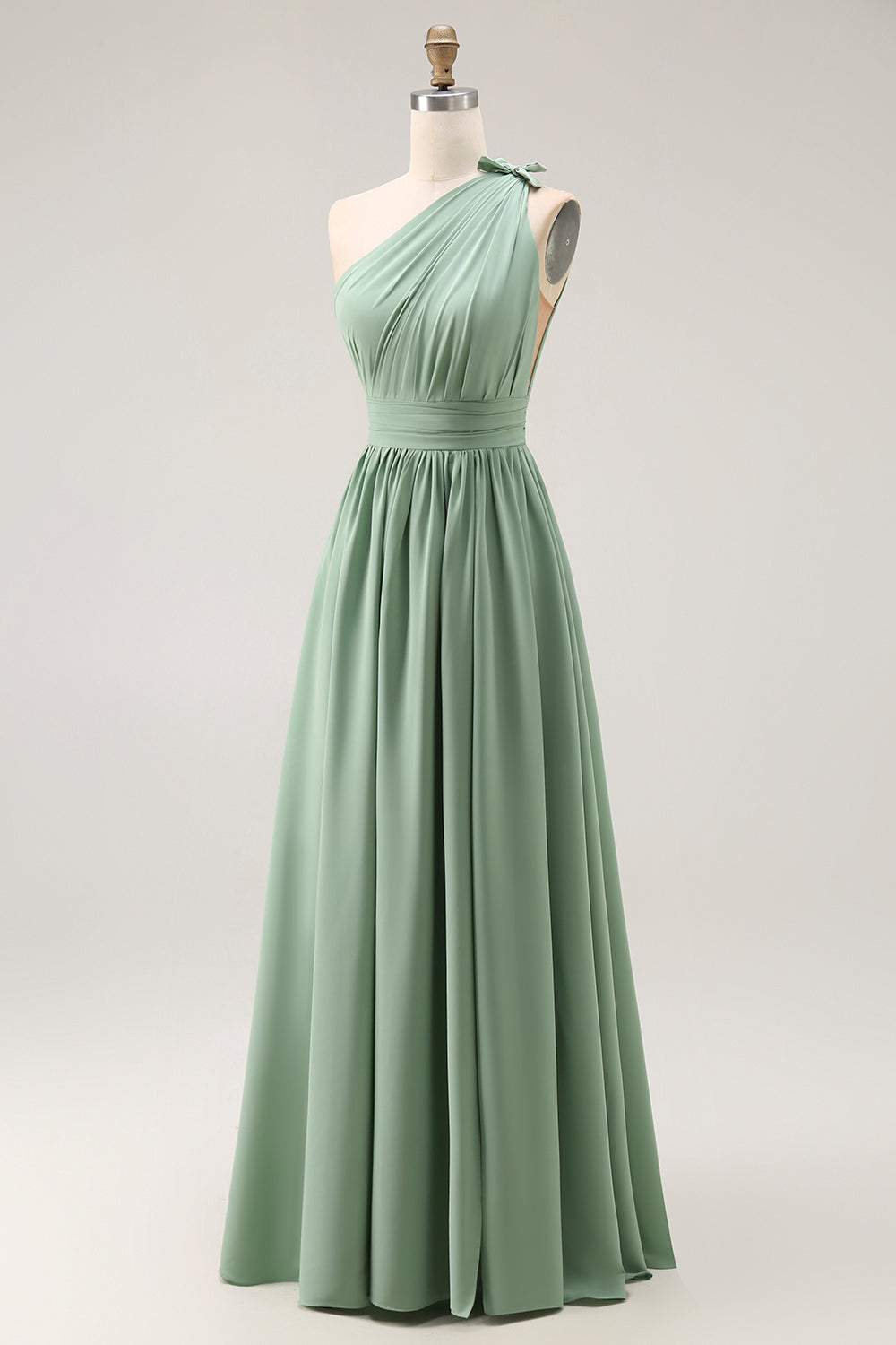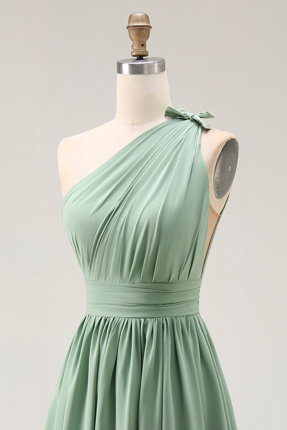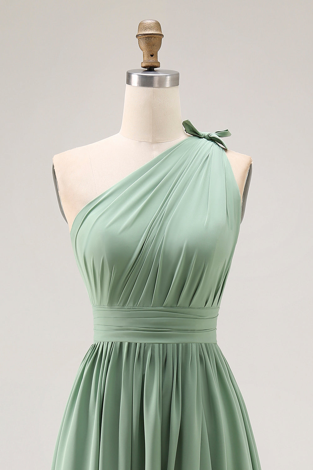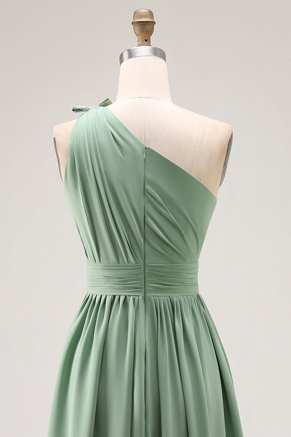 Groene A-lijn bruidsmeisjesjurk met ruches en split