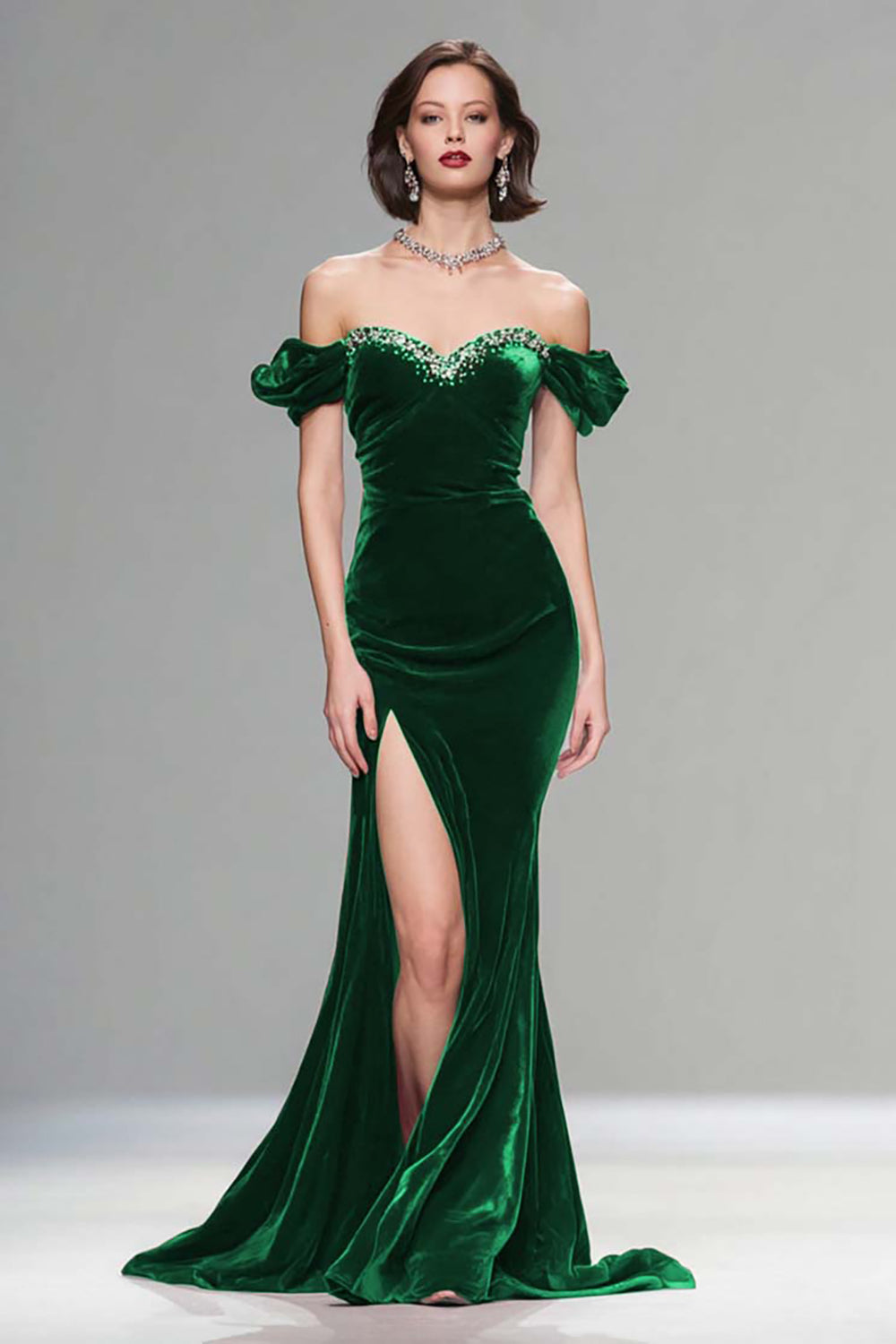 Sprankelende bordeauxrode fluweel lange formele jurk over de schouder