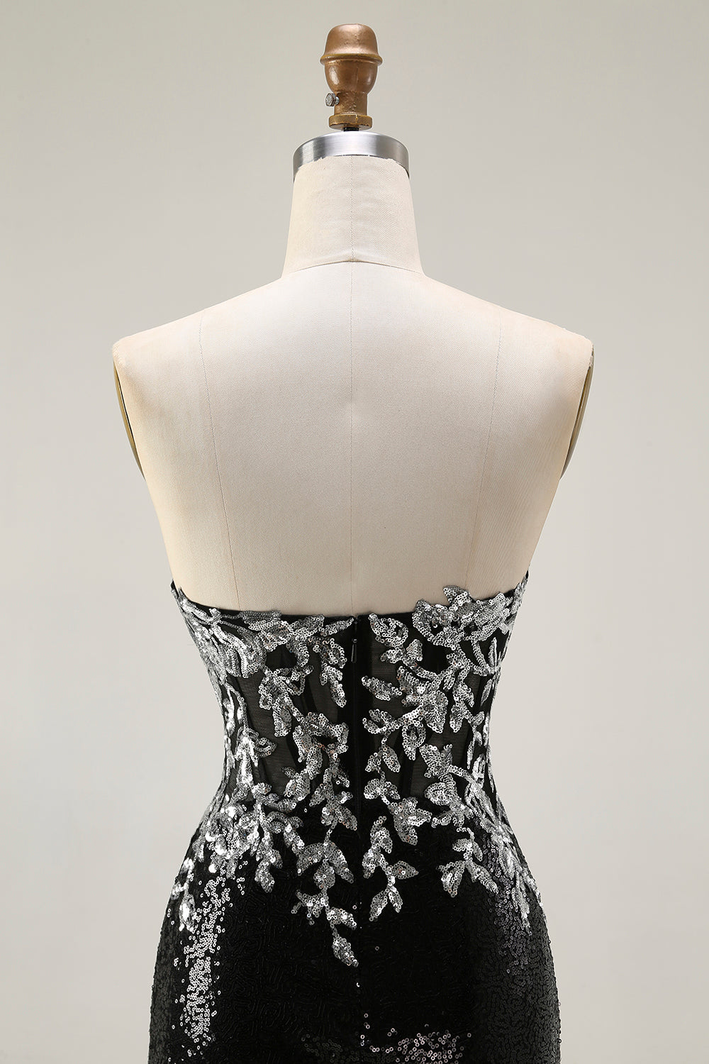 Sprankelende zwarte zilveren zeemeermin strapless pailletten korset strapless lange galajurk