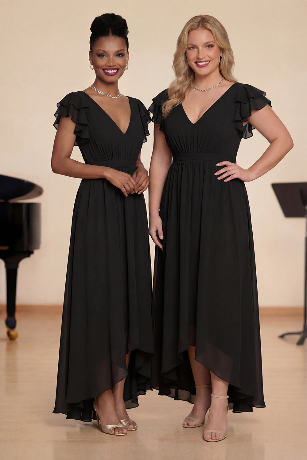 Marineblauwe Chiffon A-lijn V-hals koorjurk met fladderende mouwen