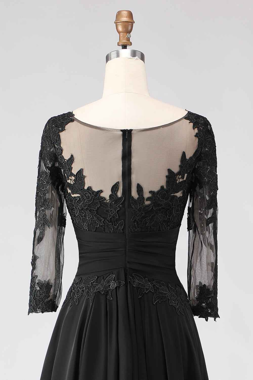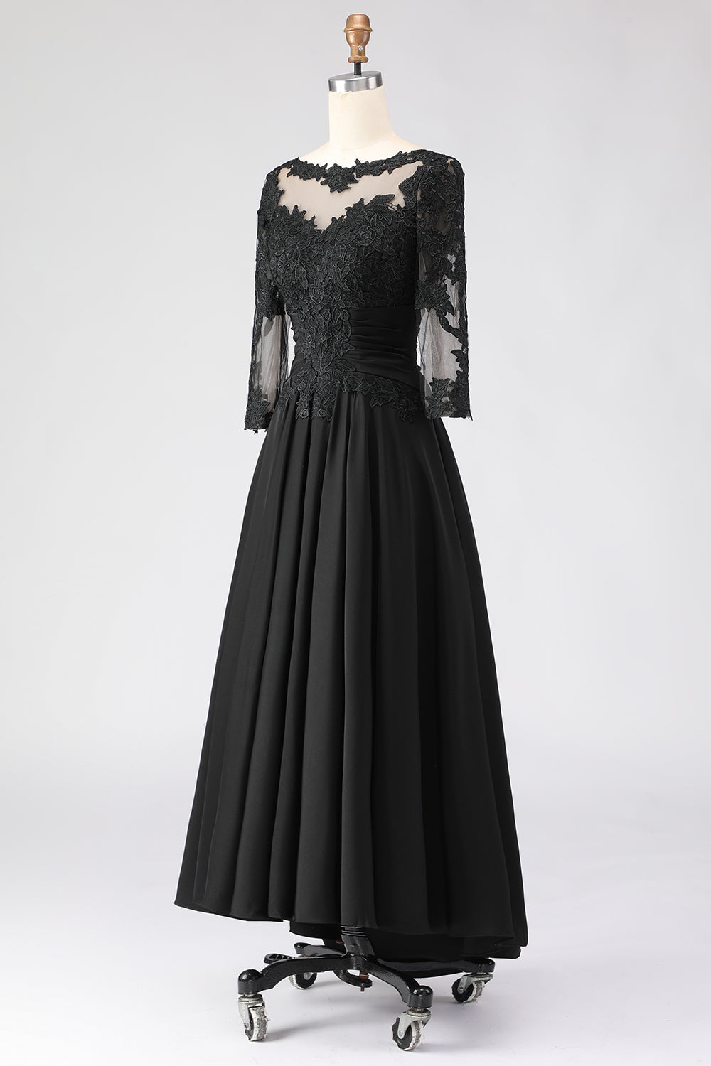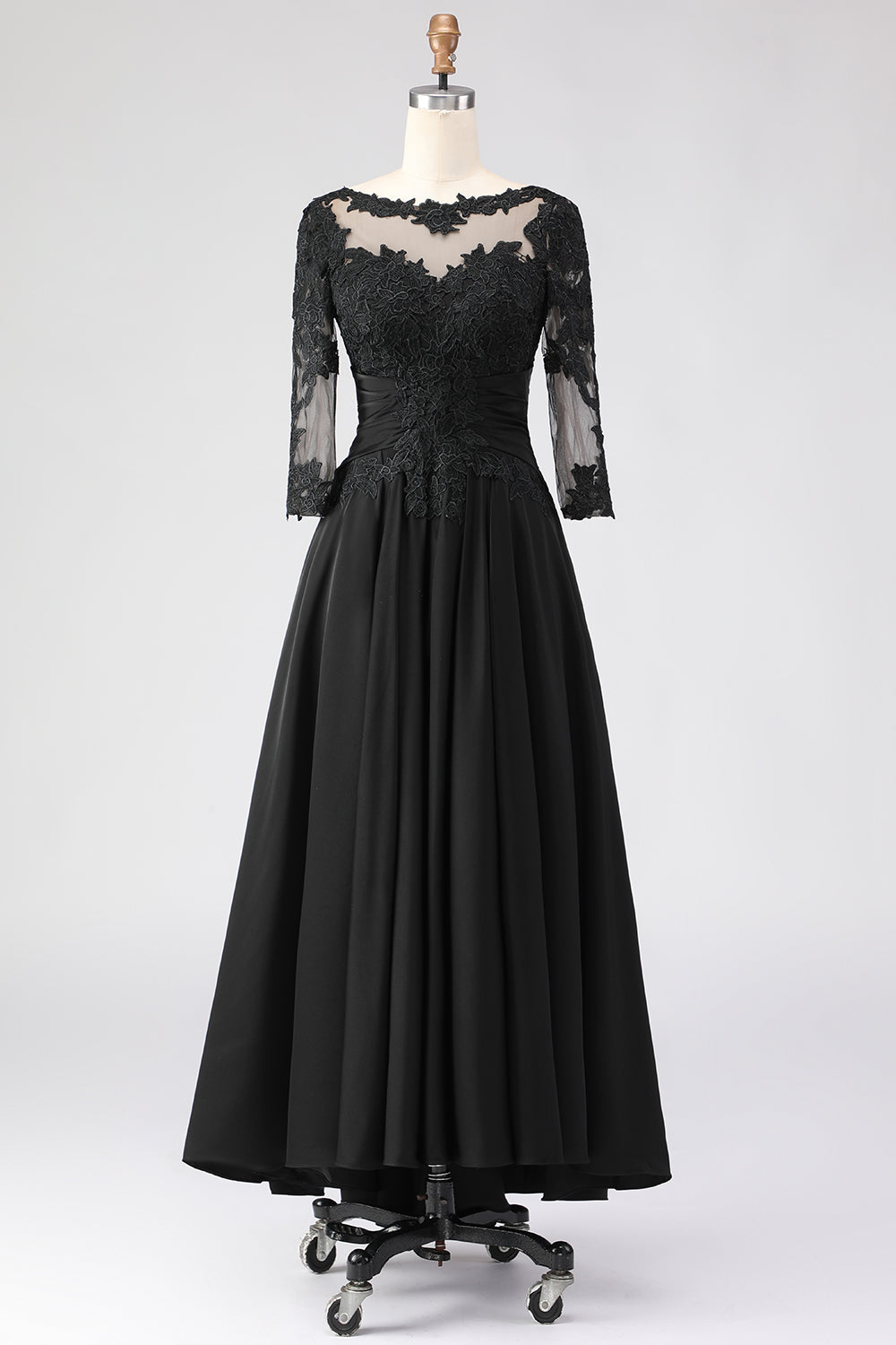 Zwarte A-lijn theelengte 3/4 mouwen Mother of the Bride jurk met applicaties