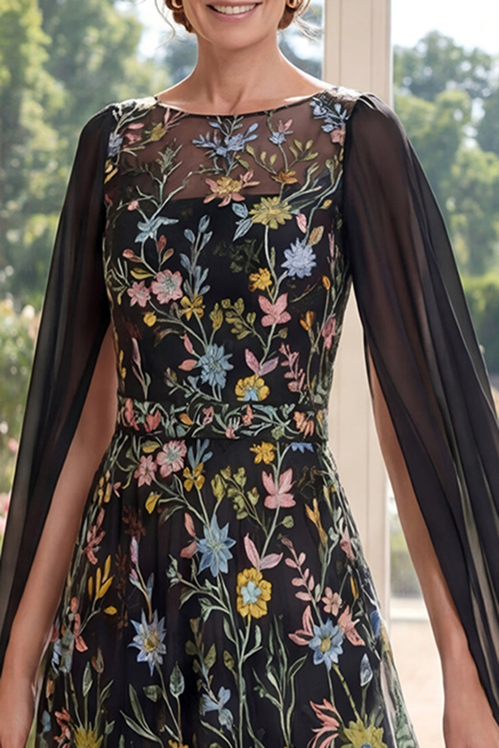 Zwarte tule lange jurk met een lange moeder van de bruid geborduurde A-lijn met cape-mouwen