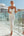 Eenvoudige ivoorkleurige, gelaagde korte trouwjurk met hoge hals en ruches