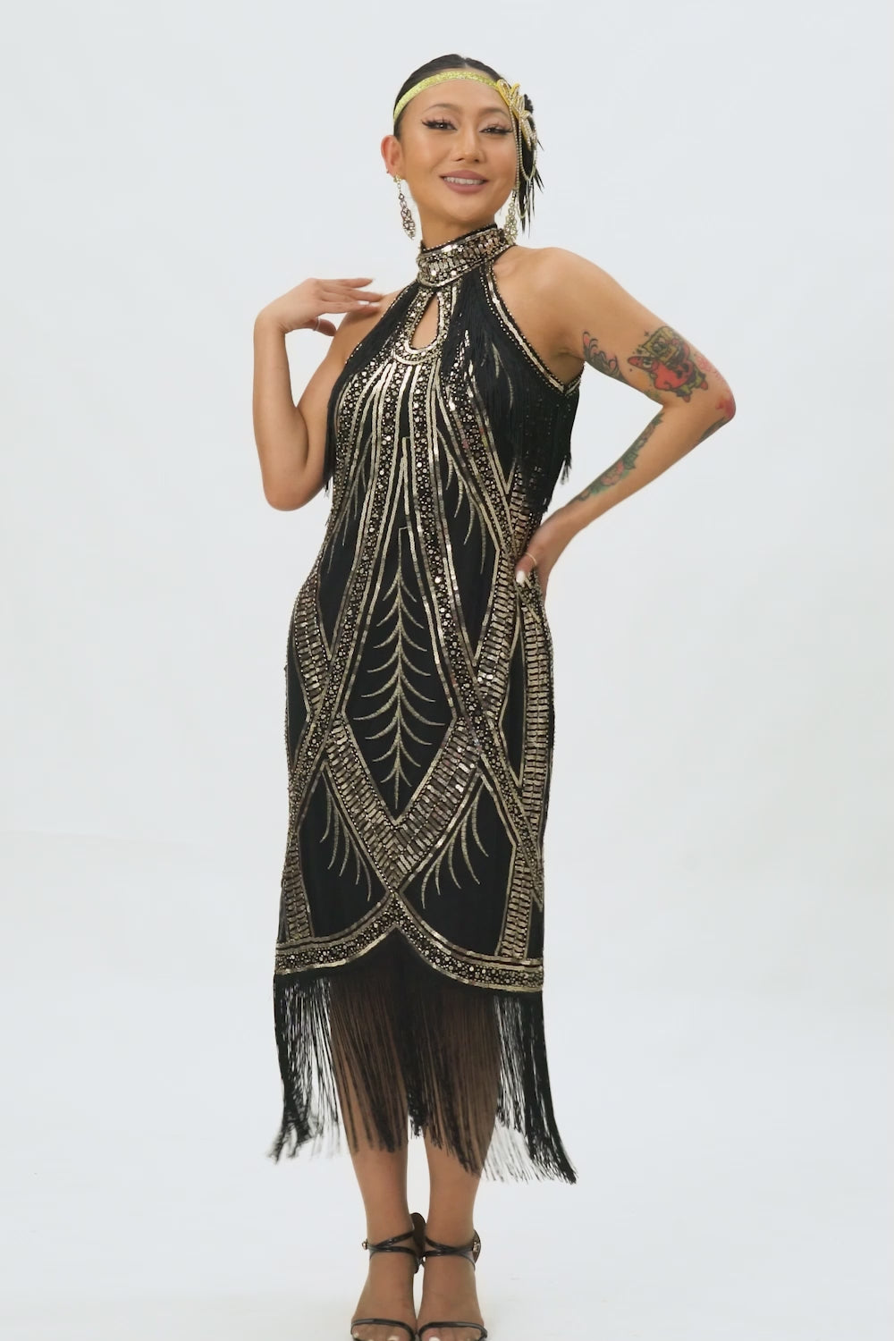 Bodycon halter zwarte gouden pailletten jaren 1920 jurk met franjes